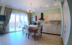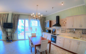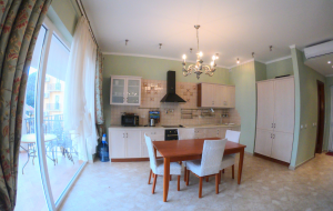 В апартаментах есть одна спальня, гостиная с кухней, ванная комната, вся необходимая мебель и техника. В квартире установлены теплые полы, кондиционеры, тв и интернет. Рядом с домом есть паркинг.
