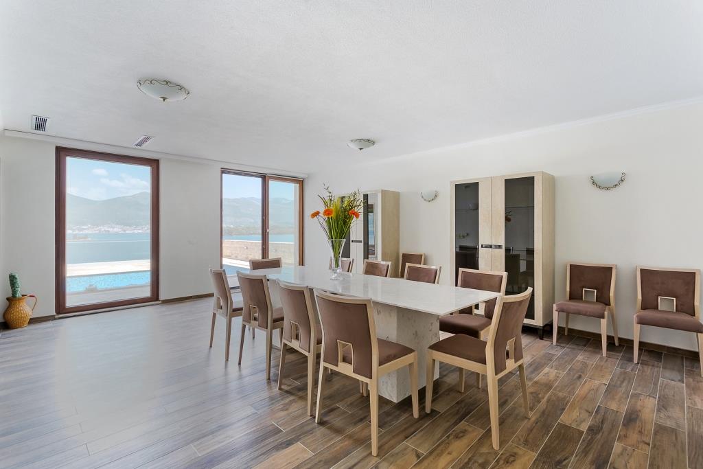 Благодаря расположению виллы на берегу закрытого залива, здесь не бывает штормов, характерных для этих широт в зимнее время года. Тем самым сохраняется в целости береговая полоса. Из окон и с террас виллы открываются неповторимые виды. В Тиватской бухте уже много лет живет большая семья дельфинов, которых частенько можно наблюдать с берега; напротив виден пролив в Которскую бухту, с двух сторон зажатый высокими горами; слева виден город Герцег-Нови, напротив - Тиват и марина Porto Montenegro, а слева - вершина горы Ловчен, где снег лежит до мая. По заливу перед виллой постоянно движутся суда - небольшие парусные яхты, моторные катера и большие круизные лайнеры.