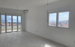 Апартамент расположен на седьмом этаже восьмиэтажного здания. Он включает просторную гостиную с кухней и обеденной зоной, две спальни, ванную комнату, прихожую и террасу с видом на город и море. Выход на террасу осуществляется из гостиной. Апартамент продается в чистовой отделке, с сантехникой, без мебели.