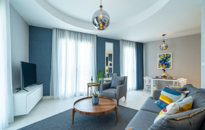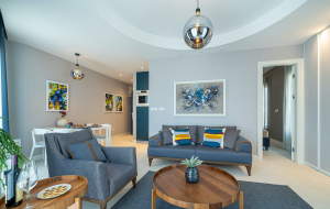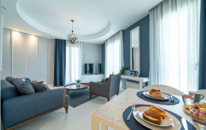 В четырехэтажном здании есть подземный гараж, на нижнем этаже располагаются коммерческие помещения, на остальных этажах – жилые апартаменты. При строительстве здания и внутренней отделке апартаментов используются самые качественные материалы известных мировых брендов. На продажу предлагаются апартаменты с одной и двумя спальнями, информацию по наличию и ценам можно посмотреть здесь