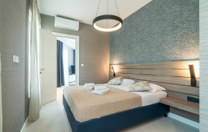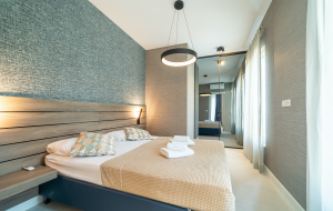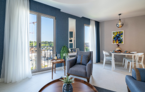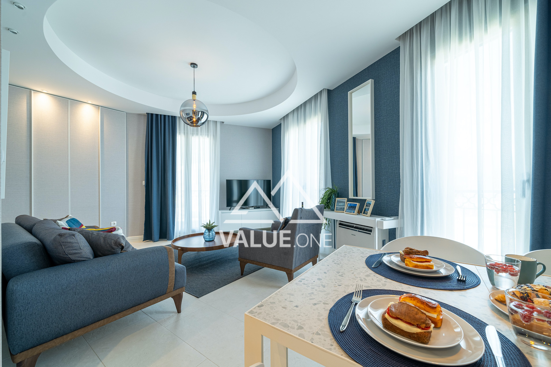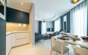 Апартамент находится на первом (европейском) этаже и включает прихожую, гостиную с кухней и обеденной зоной, спальню, ванную комнату, и постирочную. Из гостиной и спальни можно попасть на террасу, выходящую на сторону залива.