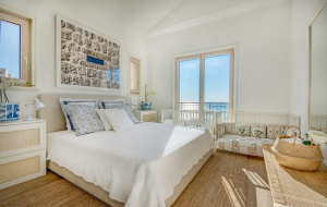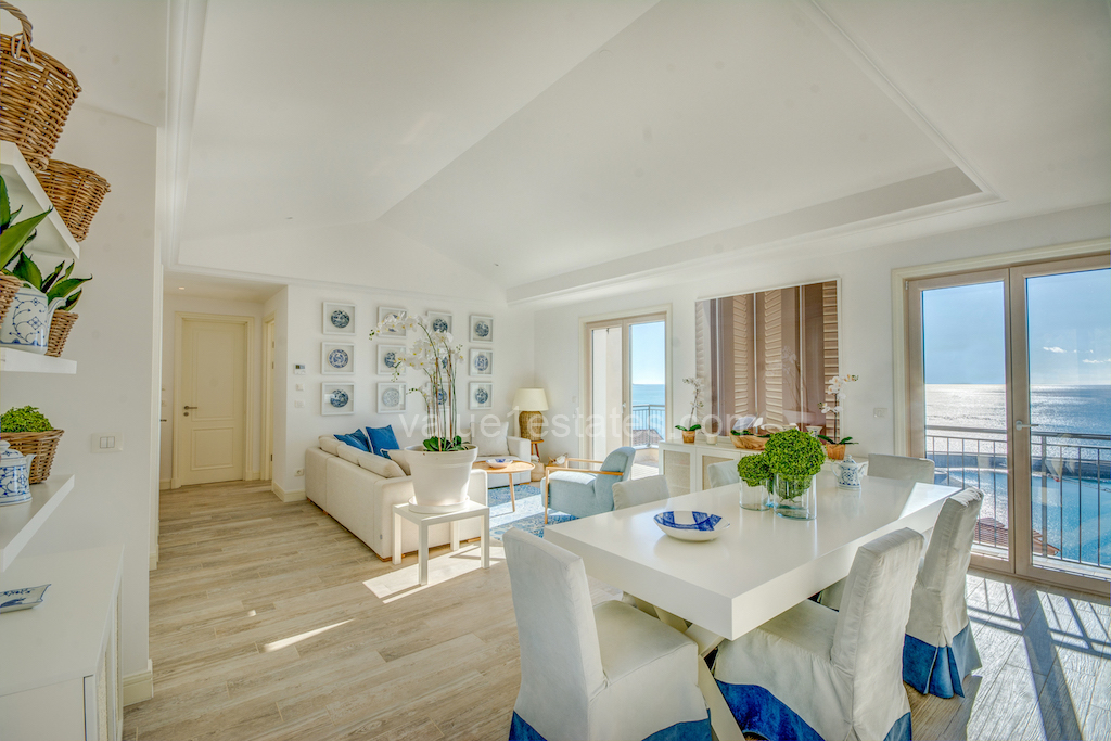 Апартамент находится на вернем этаже здания, к нему есть прямой доступ с улицы. Он включает прихожую, просторную гостиную с кухней и обеденной зоной, спальню, ванную комнату, два мини-балкона и террасу. Из окон комнат и террасы открывается прекрасный вид на море.