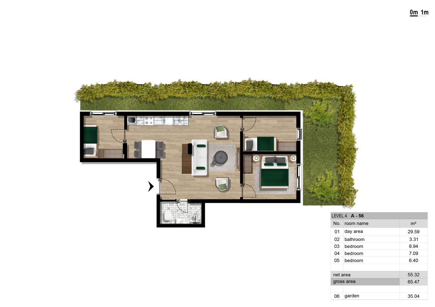 Апартаменты находятся на 4 этаже и состоят из гостиной, кухни со столовой зоной, 3 спален, 1 ванной комнаты и сада, площадью 35,04 м2. Апартаменты продаются в чистовой отделке со встроенной сантехникой.