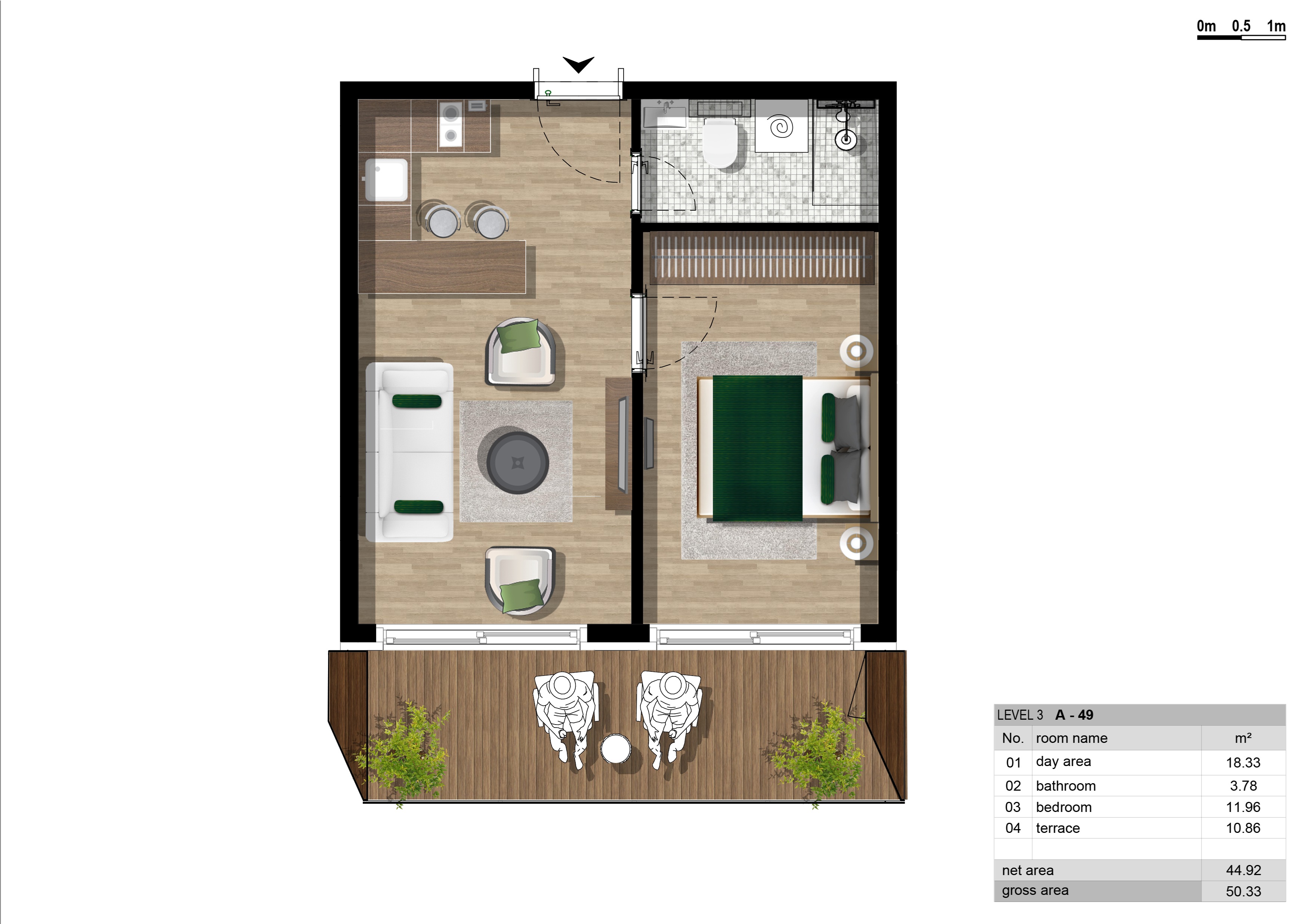 Жилой комплекс состоит из 92 апартаментов разной площади – студии, апартаменты с 1, 2 и 3 спальнями, а также пентхаусы.