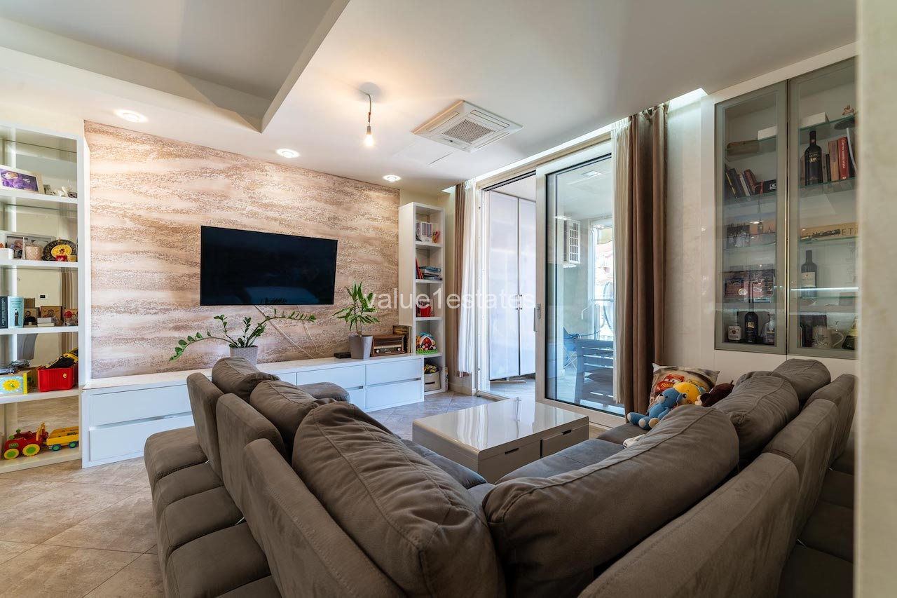 Квартира состоит из гостиной с кухней и столовой зоной, ванной комнаты, гостевого туалета и большой террасы площадью 11 м2, выходящей в тихий двор. В квартире установлены теплые полы, в каждой комнате – кондиционеры инверторного типа, остекление с UV-фильтром, высококлассное оснащение и меблировка.