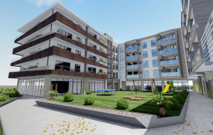 На территории комплекса предусмотрено озеленение, детская игровая площадка и зона для отдыха. В здании 5 этажей и подземный паркинг.