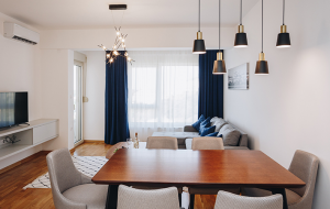 Квартира состоит из гостиной, совмещенной с кухней и столовой зоной, двух спален, ванной комнаты и террасы с видом на горы. Квартира продается в чистовой отделке и готова для установки мебели. На фото показан шоурум меблированной квартиры.