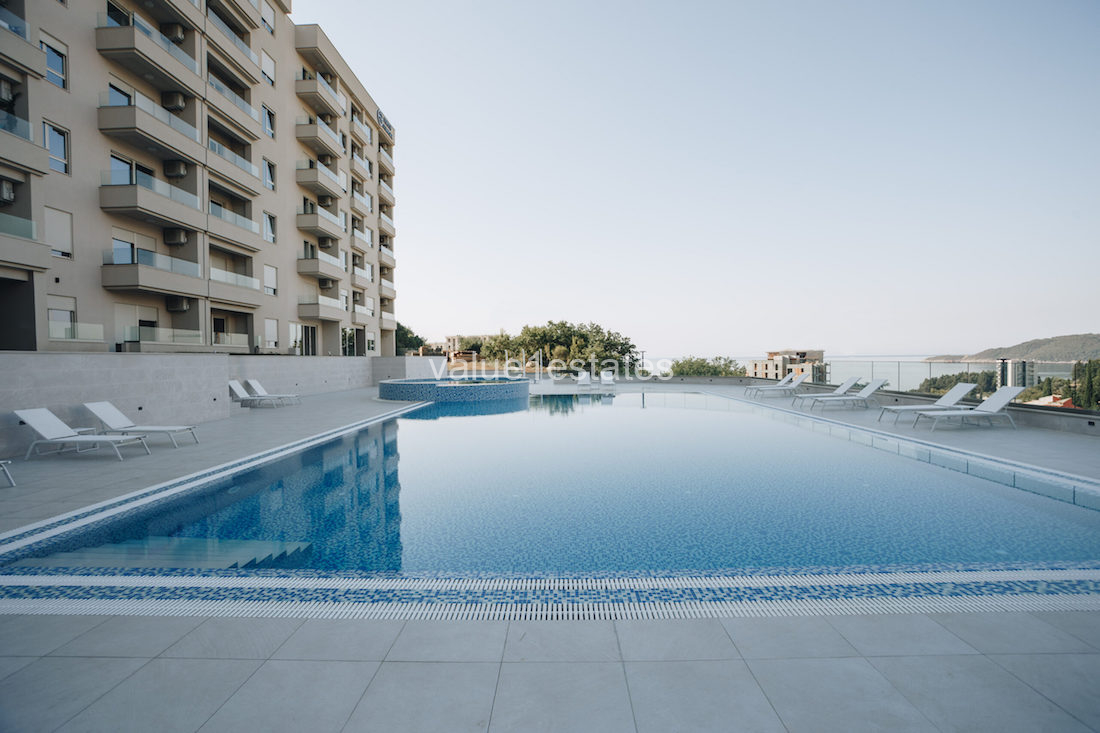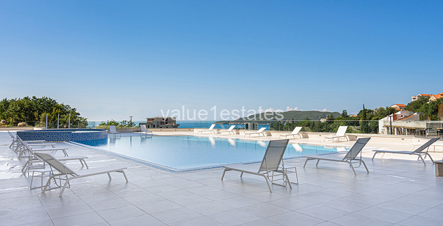 Новая трехкомнатная квартира с видом на горы в жилом комплексе в городе Бечичи, в 600 м от моря, недалеко от отеля Queen of Montenegro.