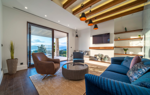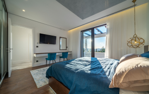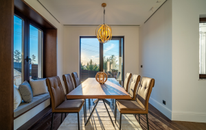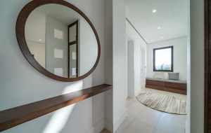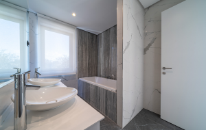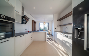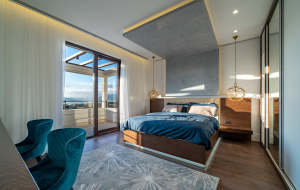 В ванных комнатах установлена сантехника Villeroy & Bosh и Hansgrohe. На кухне и в ванных комнатах установлены теплые полы. В гостиной преобладает сочетание традиционных и современных элементов, таких как деревянные балки и венецианская штукатурка. В столовой зоне установлена обеденная группа на 6 человек у больших панорамных окон, что позволяет любоваться морем и природой, обедая в кругу семьи.
