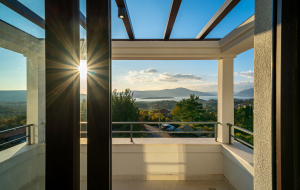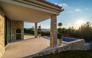 Из гостиной имеется выход на внешнюю террасу с зоной для барбекю и пейзажным бассейном. Все фасады облицованы натуральным камнем, высажены оливковые деревья.