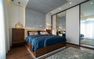 Вилла, общей площадью 185 м2, состоит из гостиной со столовой зоной, кухни, подсобного помещения, технического помещения, двух просторных спален и двух ванных комнат. На второй этаж ведет лестница с металлическим ограждением и светодиодными светильниками, что усиливает пространственный эффект лестницы.