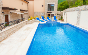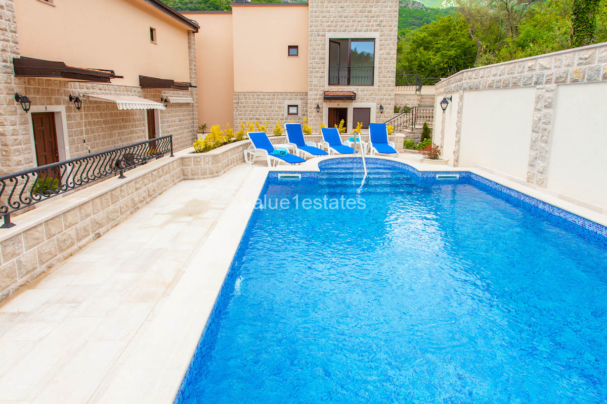 Сам комплекс построен в медитеранском стиле и состоит из 8 дуплексов. На внутренней территории дома расположен бассейн с очисткой воды морской солью и площадка с шезлонгами. Расстояние до города Будва 6 км, до Пржно и Святой Стефан- всего 1 км.