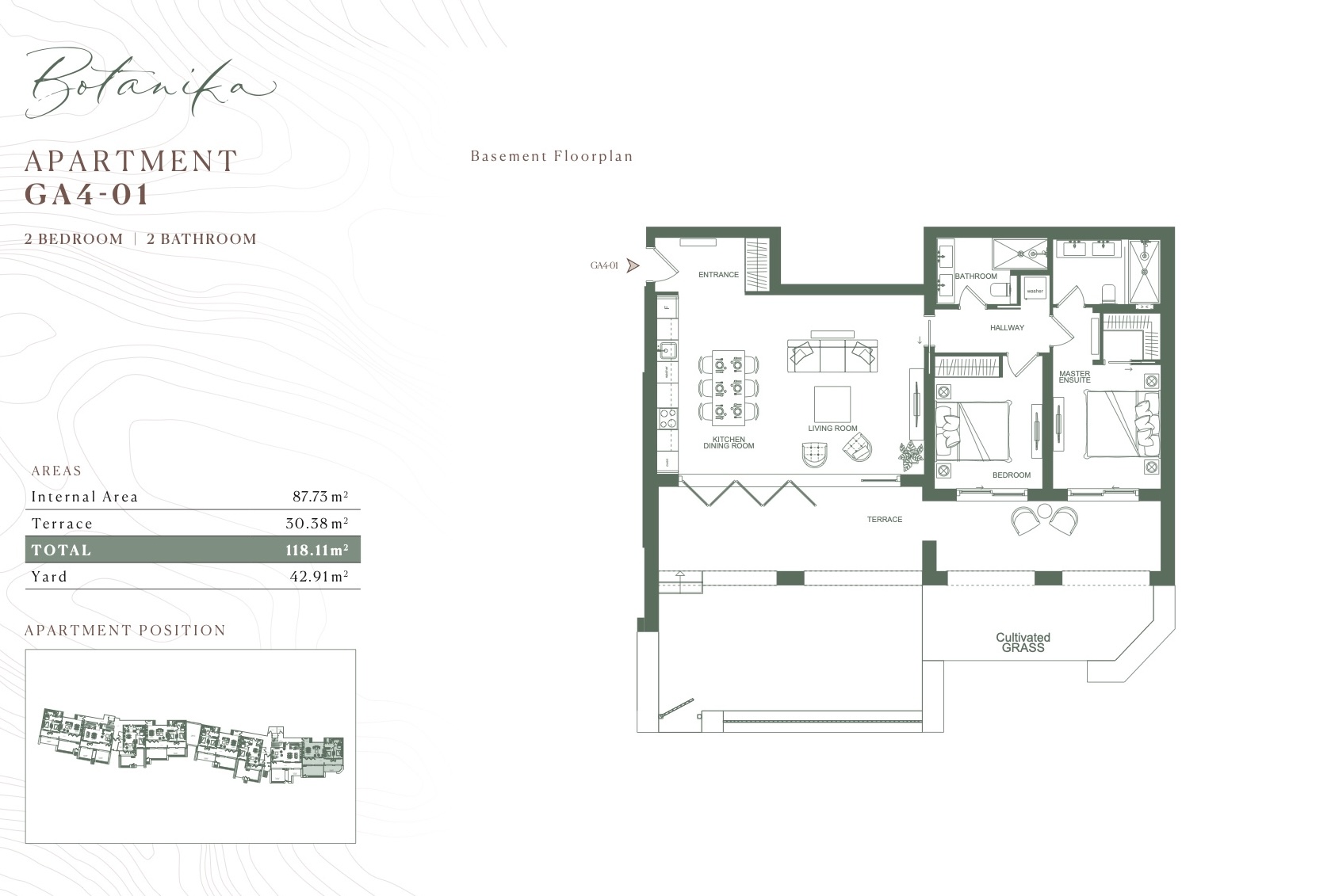 На продажу предлагаются апартаменты с 2 спальнями площадью 118 м2 и собственным двориком 43 м2.