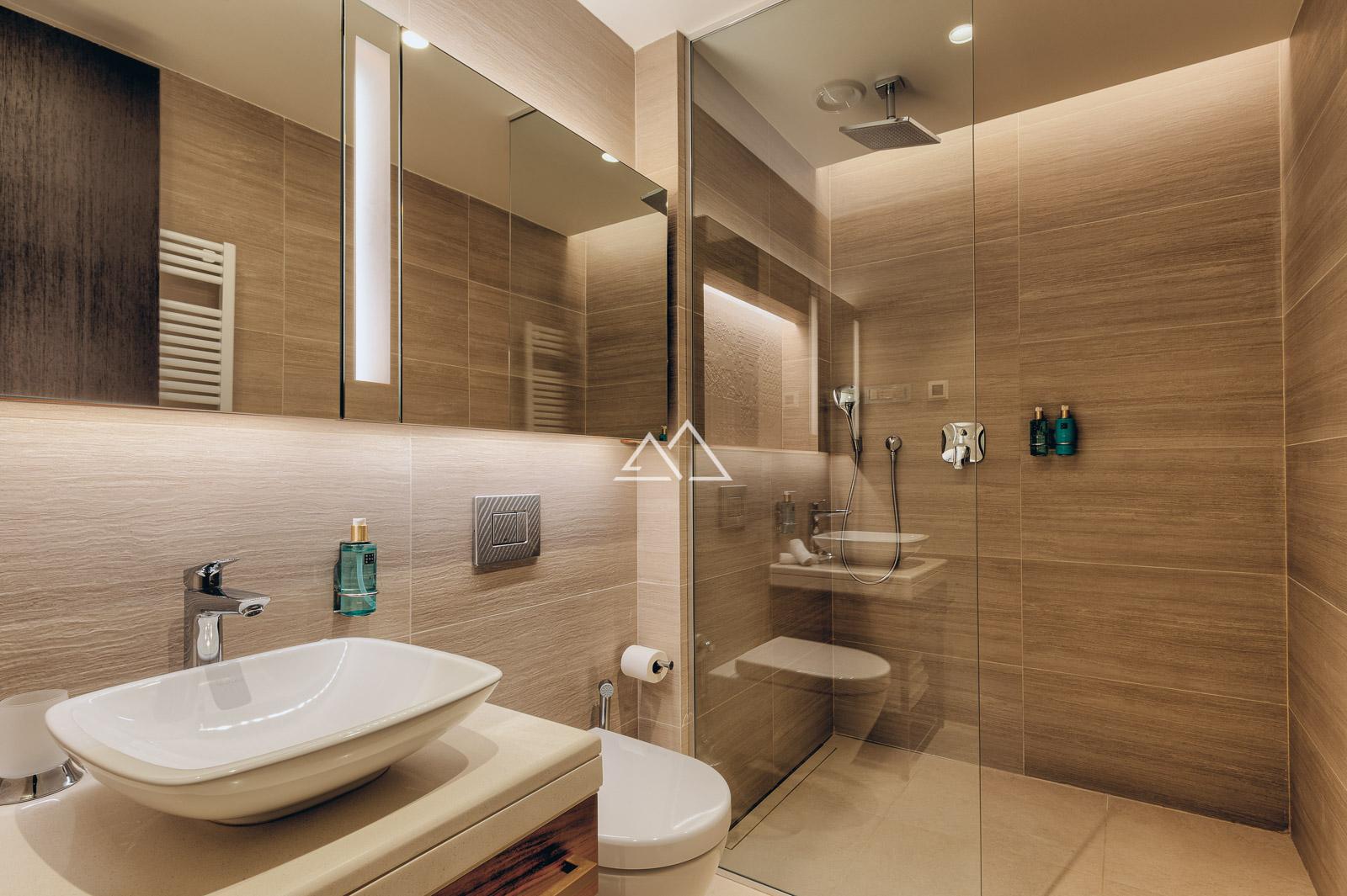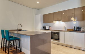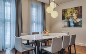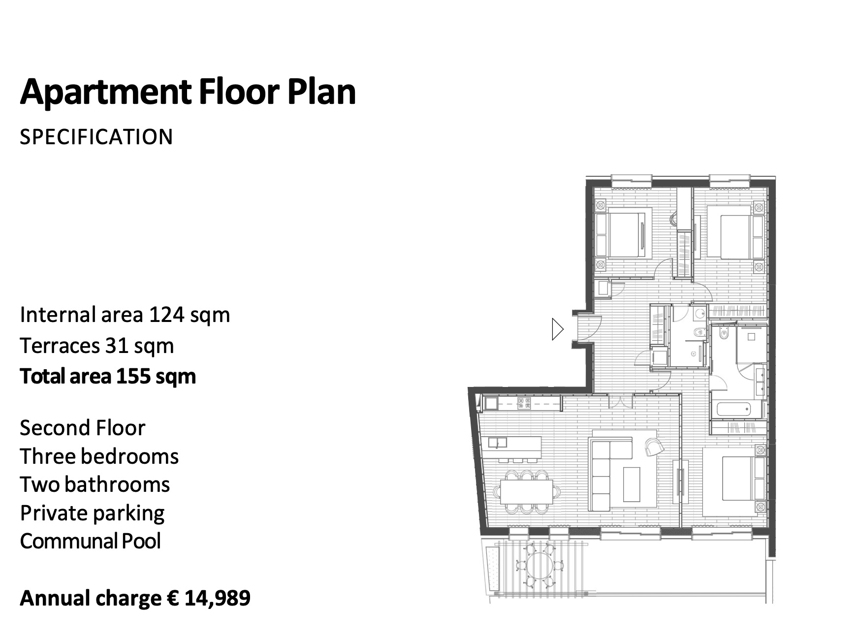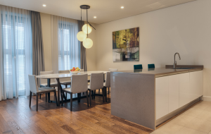 Апартаменты состоят из просторной гостиной, кухни и столовой зоны, двух спален, двух ванных комнат и террасы. Дизайн интерьеров представляет собой сочетание элегантных, хорошо освещённых пространств с современной функциональностью, создавая ощущение комфортной роскоши.