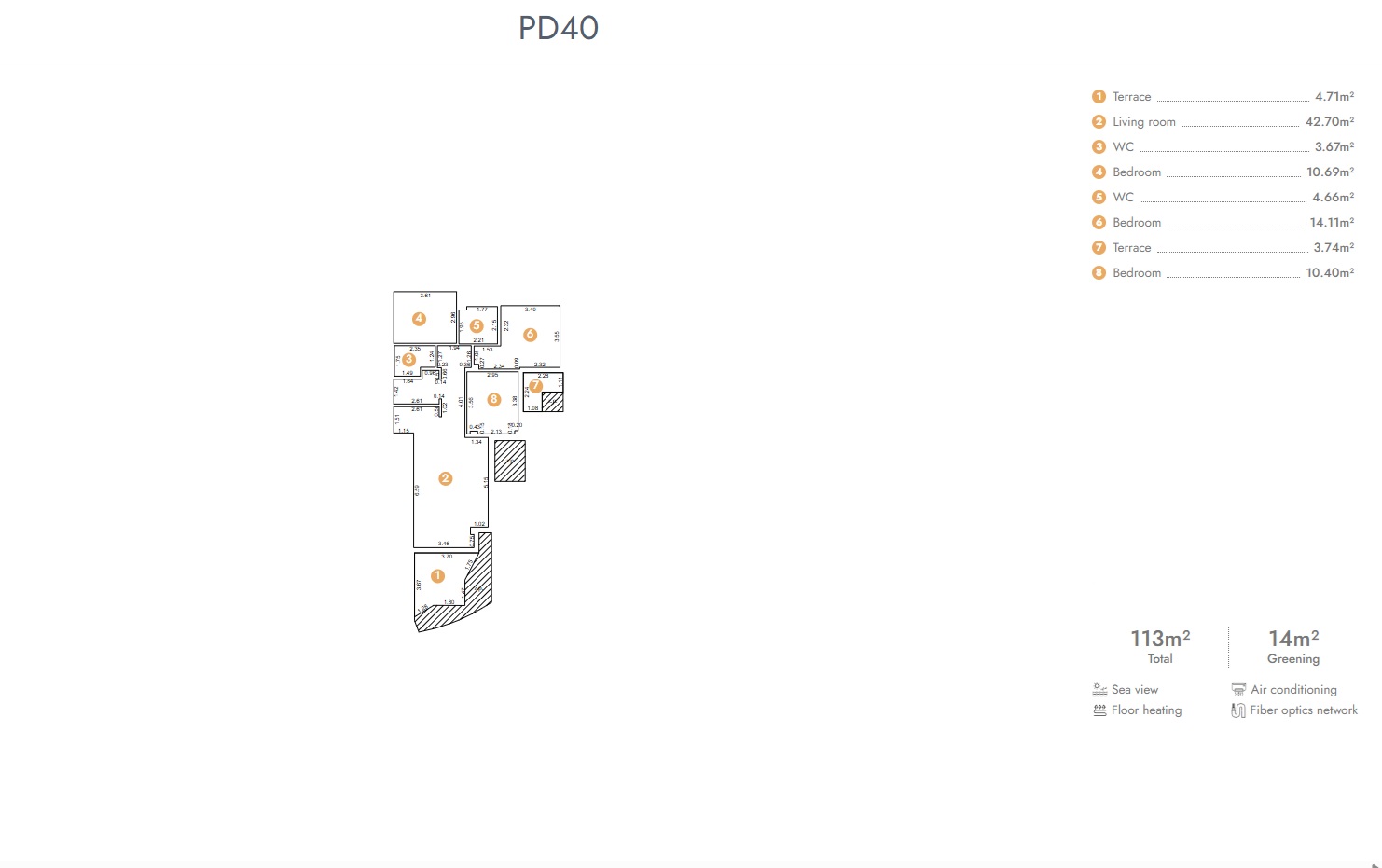 Квартира включает гостиную, совмещенную с кухней, с выходом на террасу с зеленой зоной и видом на море, три спальни, еще одну террасу и две ванные комнаты.
