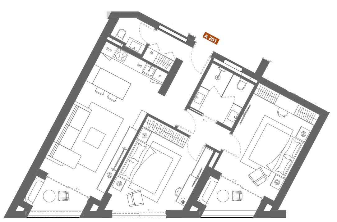 Апартаменты площадью 81,18 м2 состоят из гостиной, совмещенной с кухней, туалета, 2 спален и ванной комнаты.
