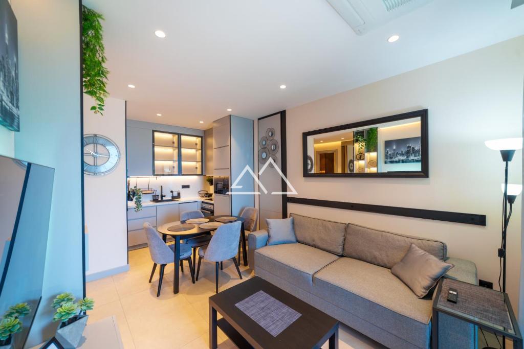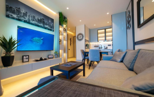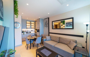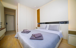 Квартира расположена на 2 этаже и состоит из коридора, гостиной, совмещенной с кухней с выходом на террасу, спальни и ванной комнаты. Квартира продается с ремонтом под ключ. Возможен ремонт по индивидуальному дизайну. Внутренняя отделка выполняется по дизайн проекту из высококачественных материалов: индивидуально отобранный мрамор, дизайнерские решения в дереве и камне. Установлена система "Умный дом" от Legrand.