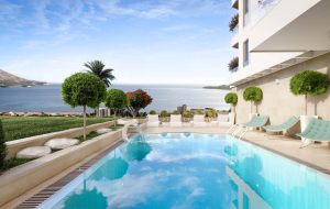 В доме 7 этажей и 24 квартиры с видом на море, панорамный лифт, бассейн с зоной для отдыха и сауна, подземный гараж.