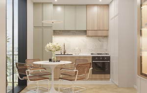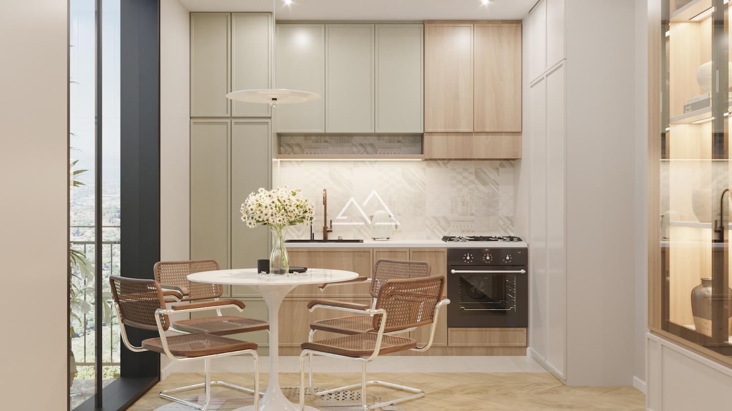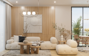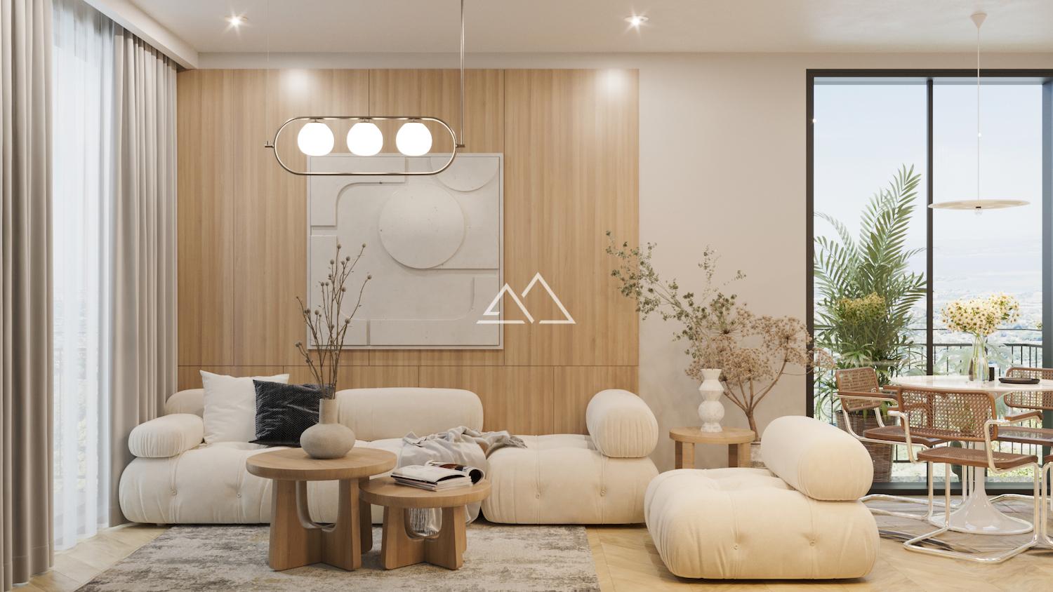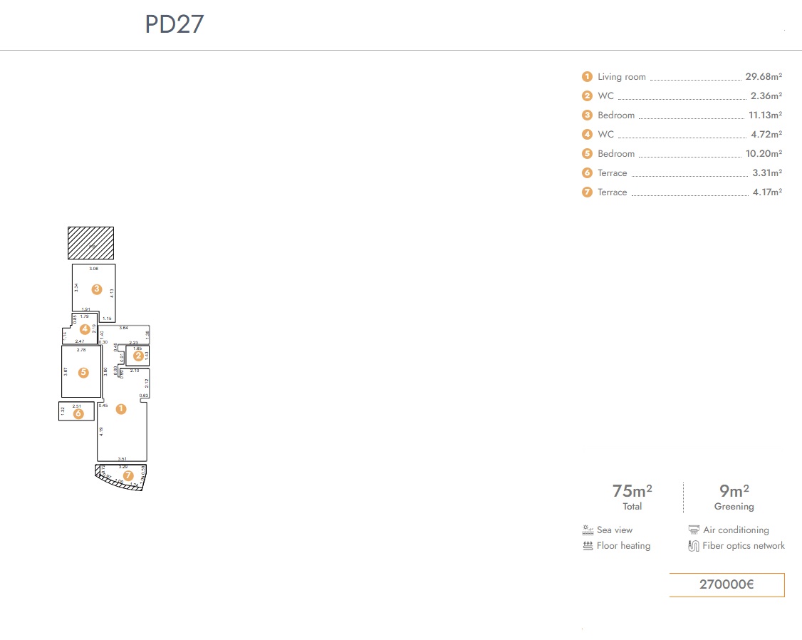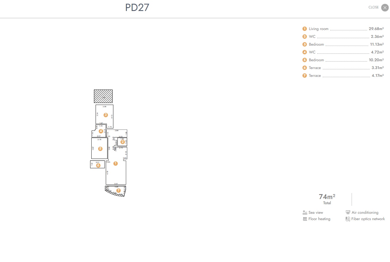 Квартира включает в себя гостиную, совмещенную с кухней с выходом на террасу, гостевой санузел, две спальни, ванную комнату и еще одну террасу.