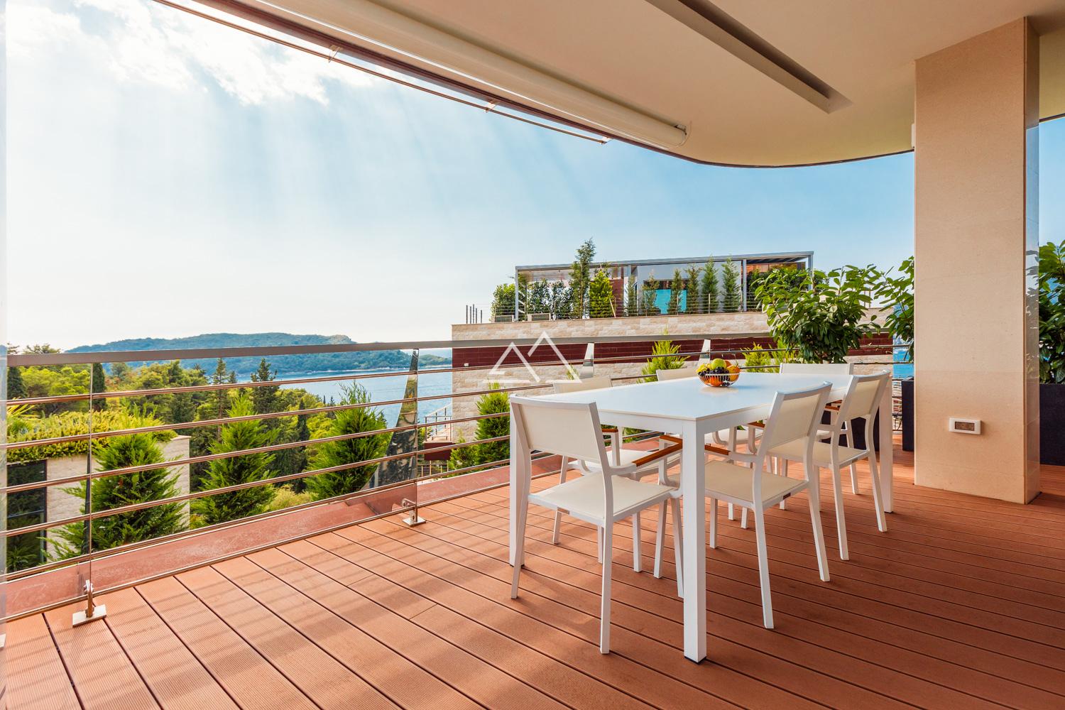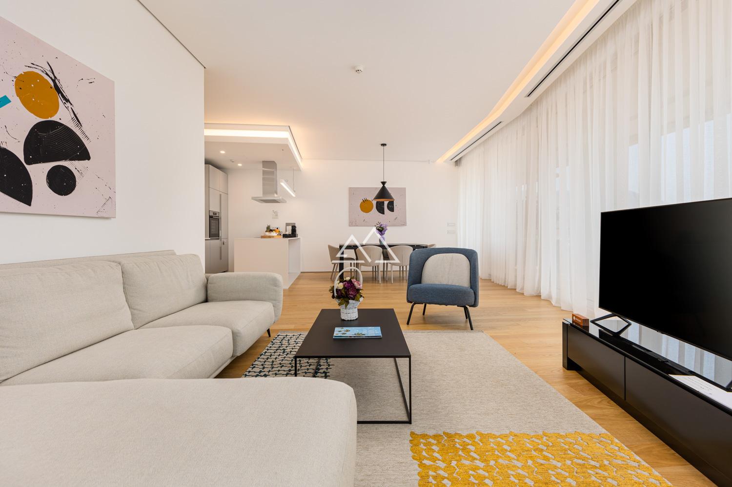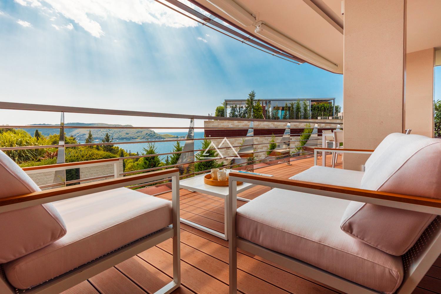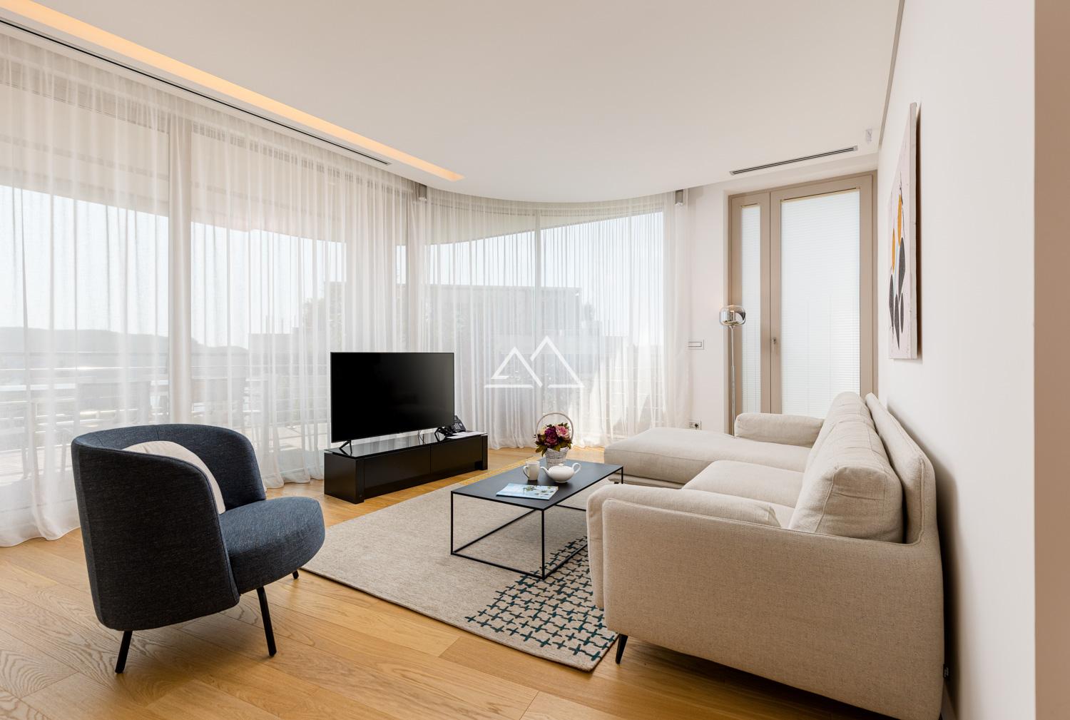 Апартаменты состоят из большой гостиной, совмещенной с кухней и обеденной зоной, трех спален, двух ванных комнат, гардеробной и просторной террасы. Из окон и террасы открывается потрясающий вид на море.
