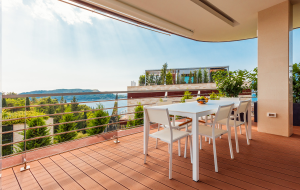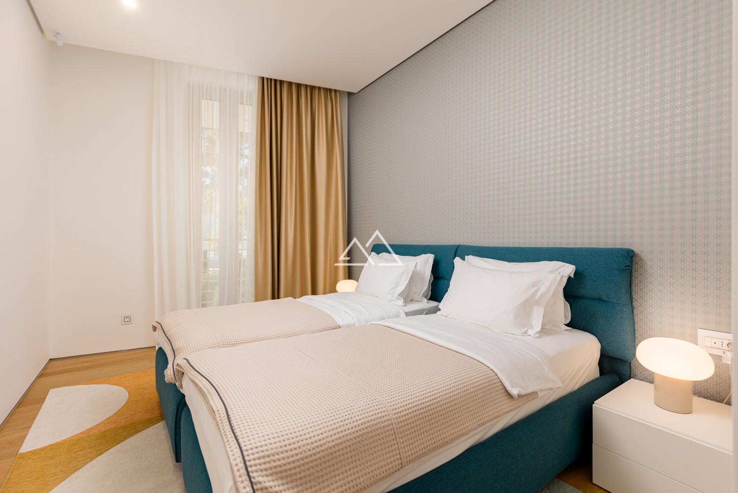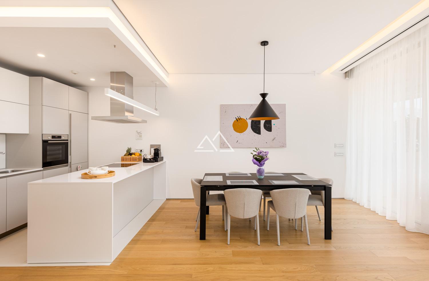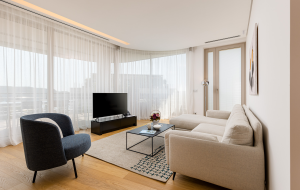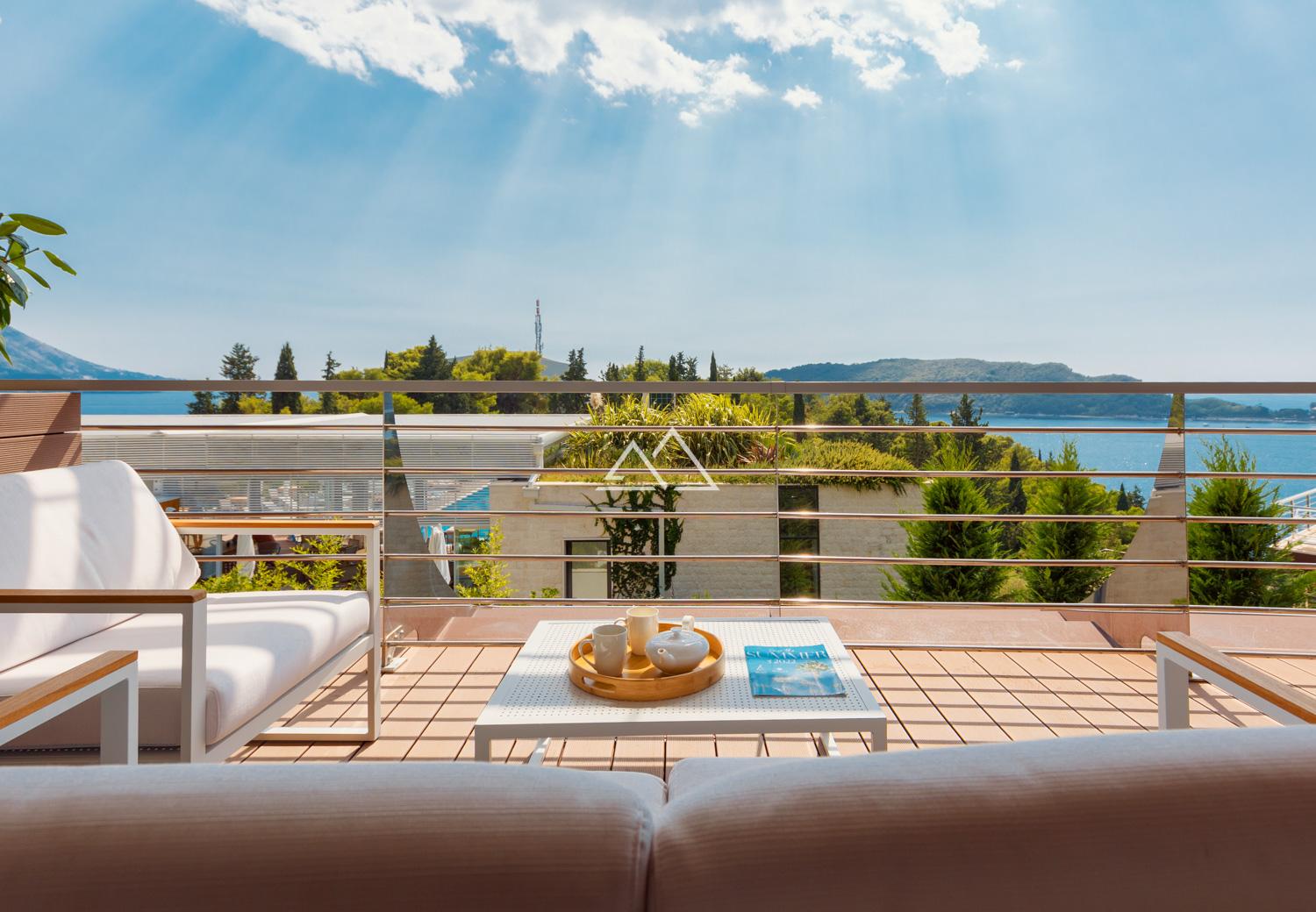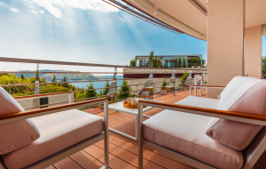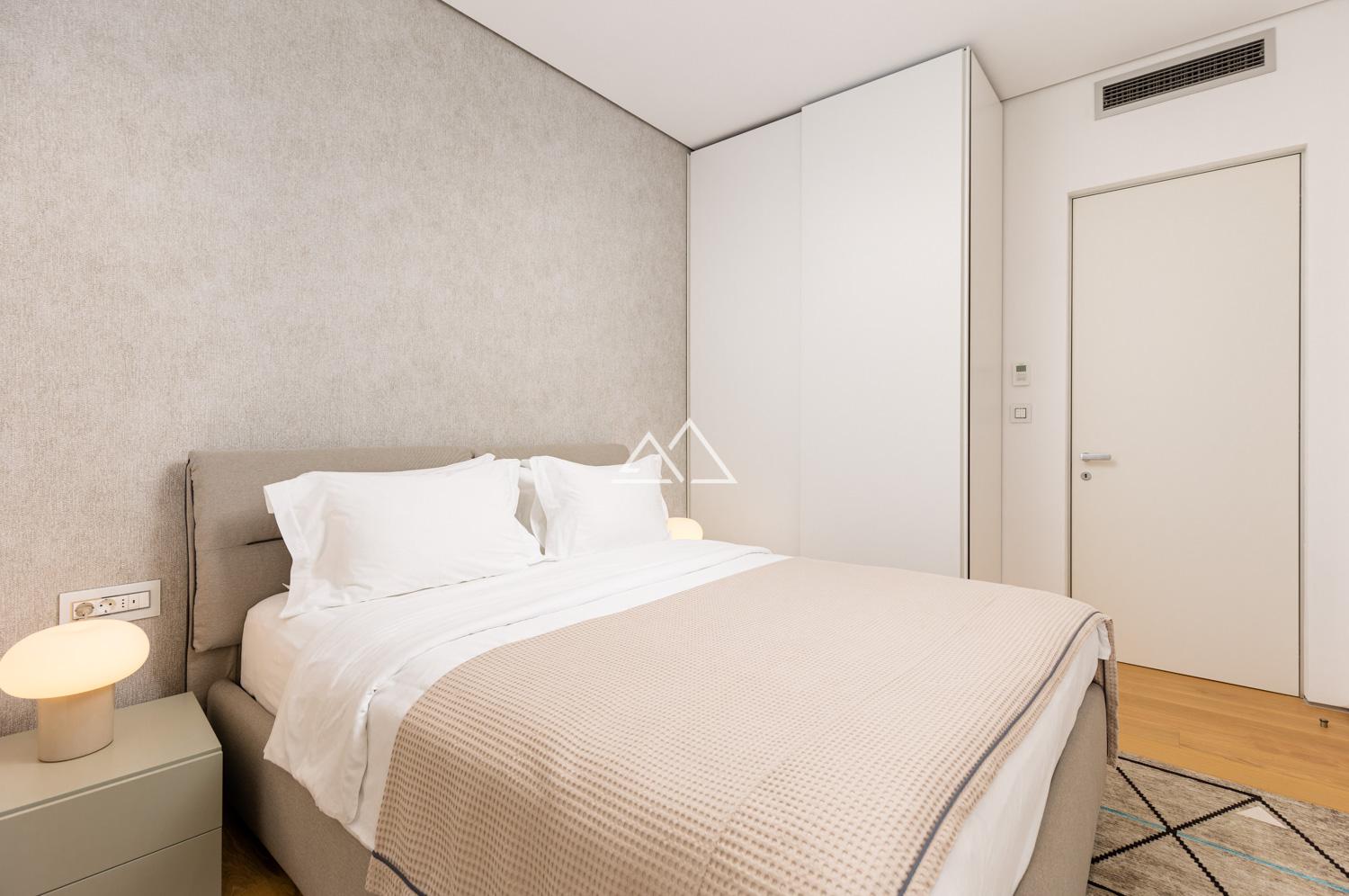 Апартаменты состоят из большой гостиной, совмещенной с кухней и обеденной зоной, трех спален, двух ванных комнат, гардеробной и просторной террасы. Из окон и террасы открывается потрясающий вид на море.
