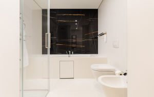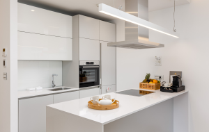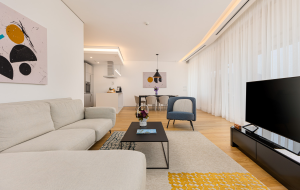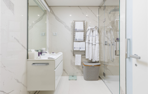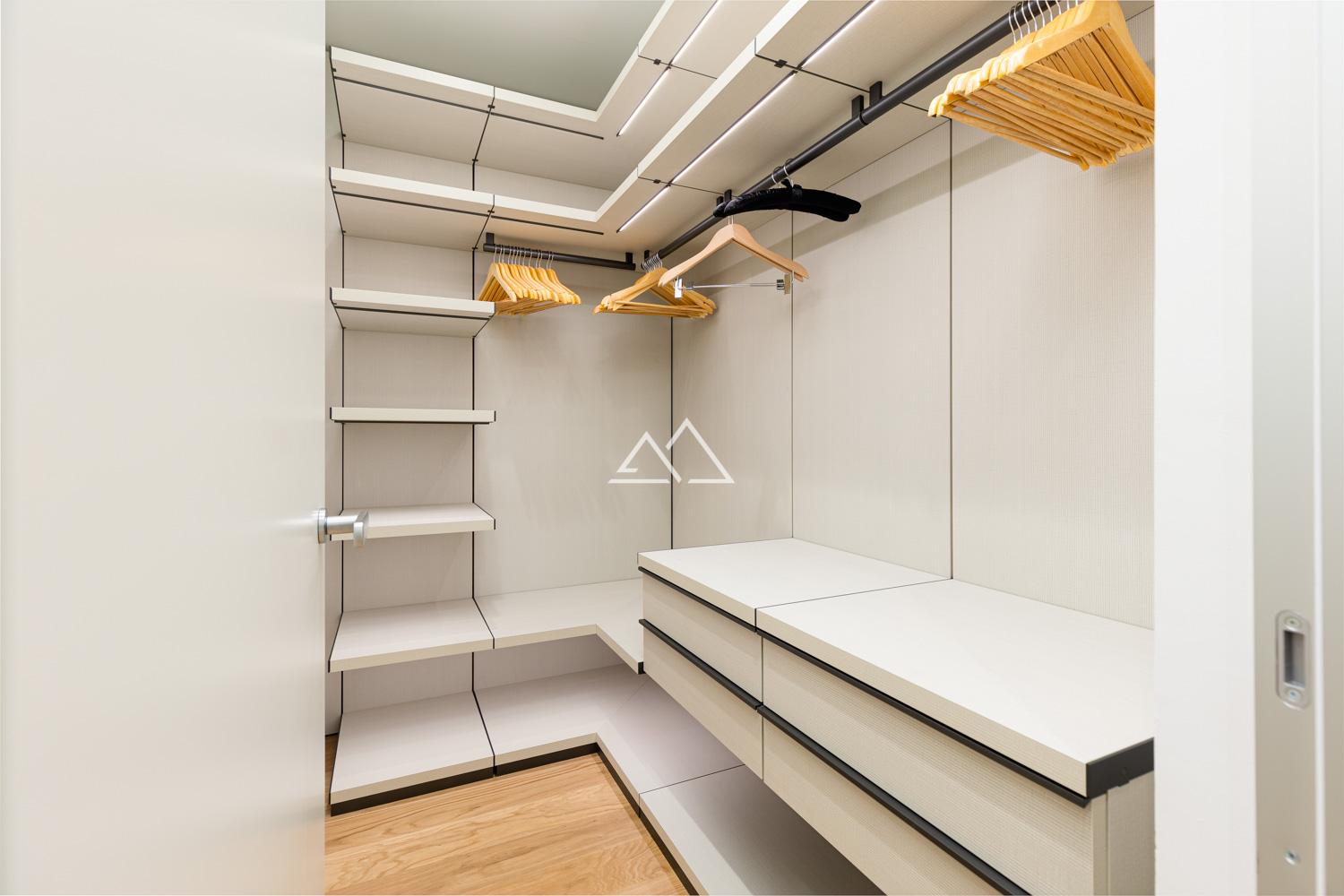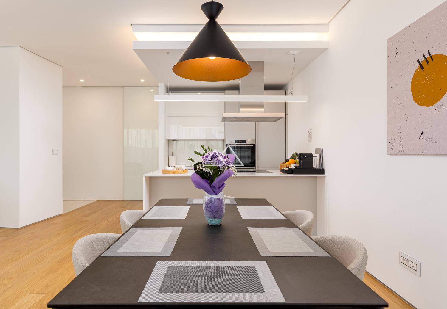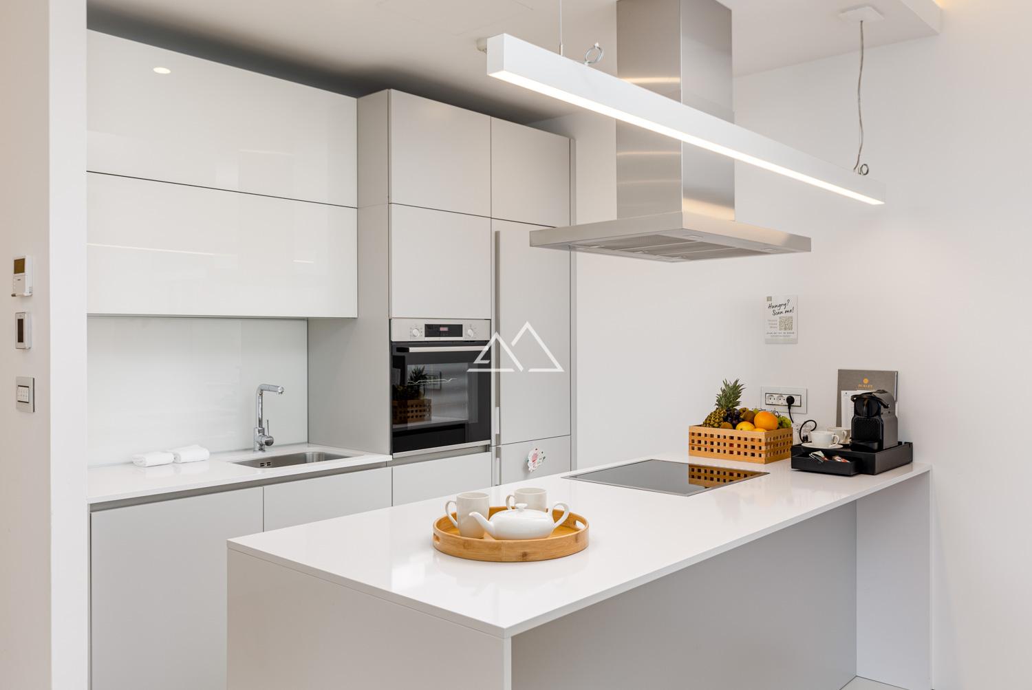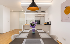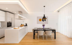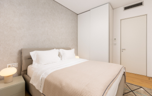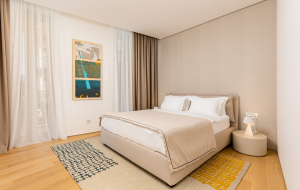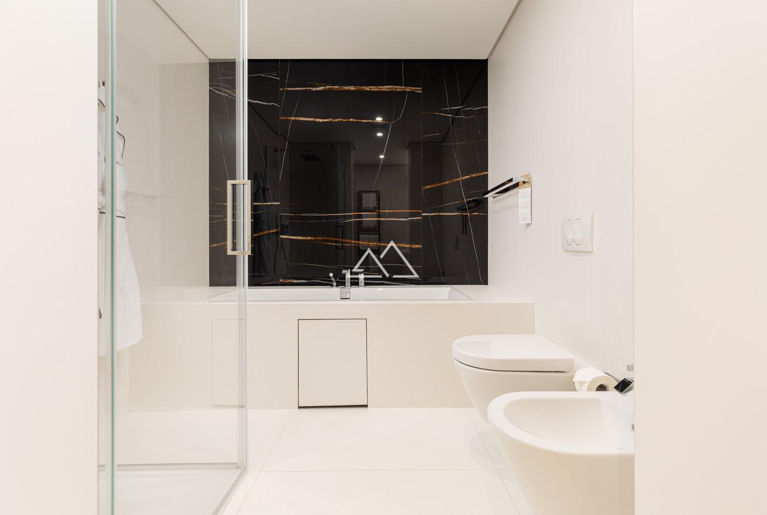 Апартаменты состоят из большой гостиной, совмещенной с кухней и обеденной зоной, трех спален, двух ванных комнат, гардеробной и просторной террасы. Из окон и террасы открывается потрясающий вид на море.
