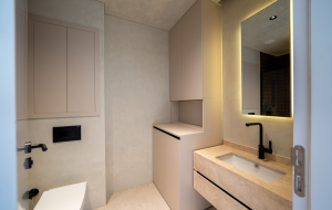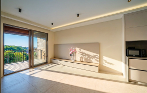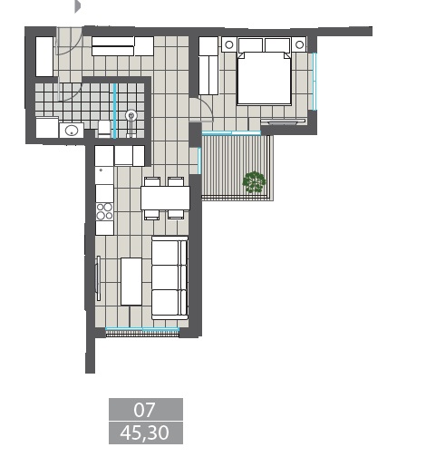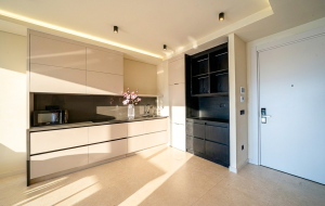 Квартира состоит из гостиной, совмещенной с кухней, спальни, ванной комнаты и террасы. Квартира продается по системе ключ в руки с мебелью и бытовой техникой. Возможен ремонт по индивидуальному дизайну. Внутренняя отделка выполняется из высококачественных материалов с добавлением природного дерева и камня, WINDFREE Samsung кондиционеры, сантехника Villeroy & Boch, Kartell LAUFEN.