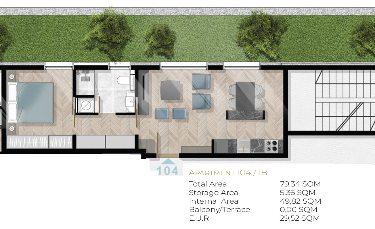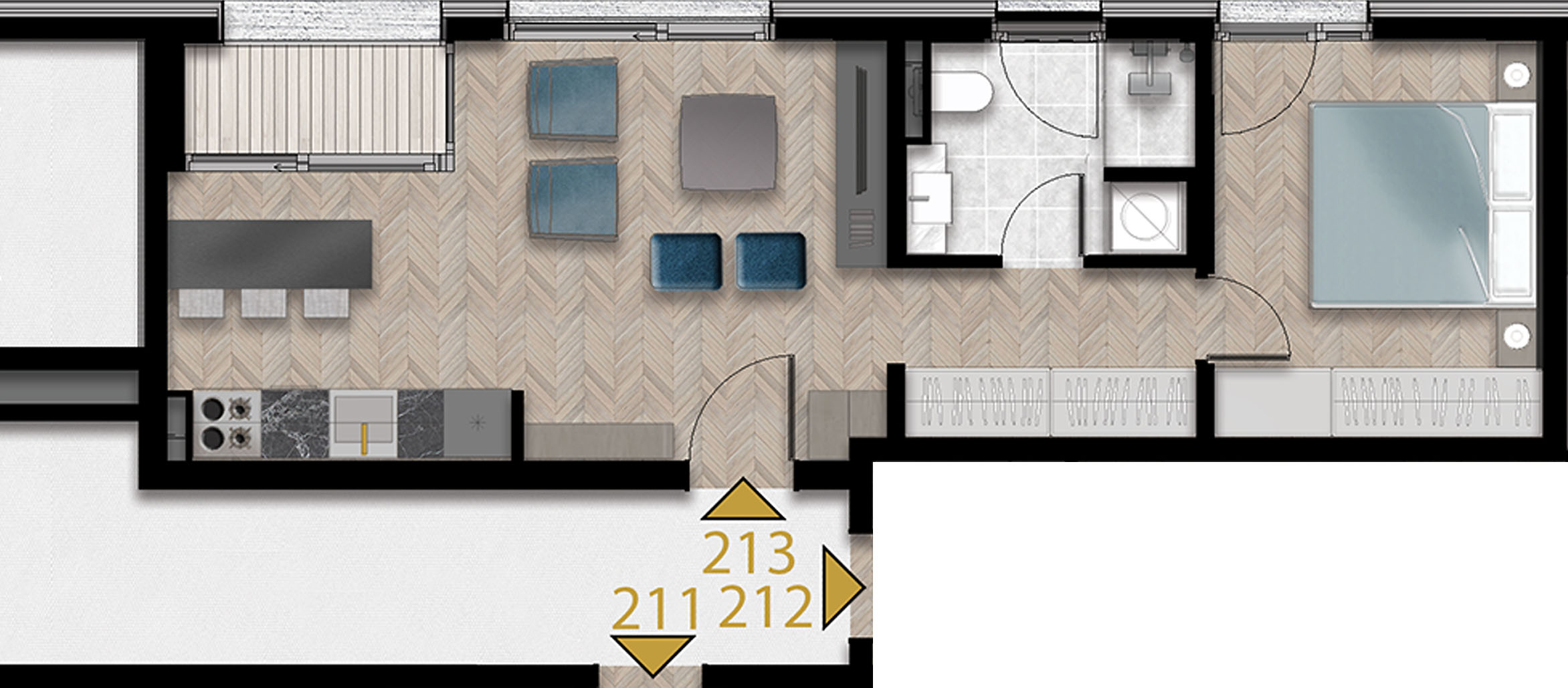 Апартаменты состоят из гостиной, совмещенной с кухней, террасы, спальни и ванной комнаты.