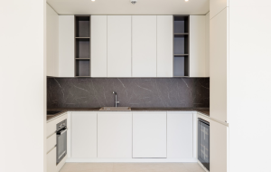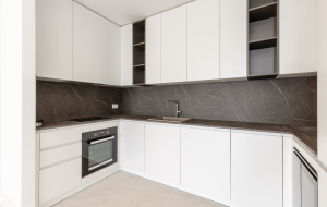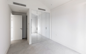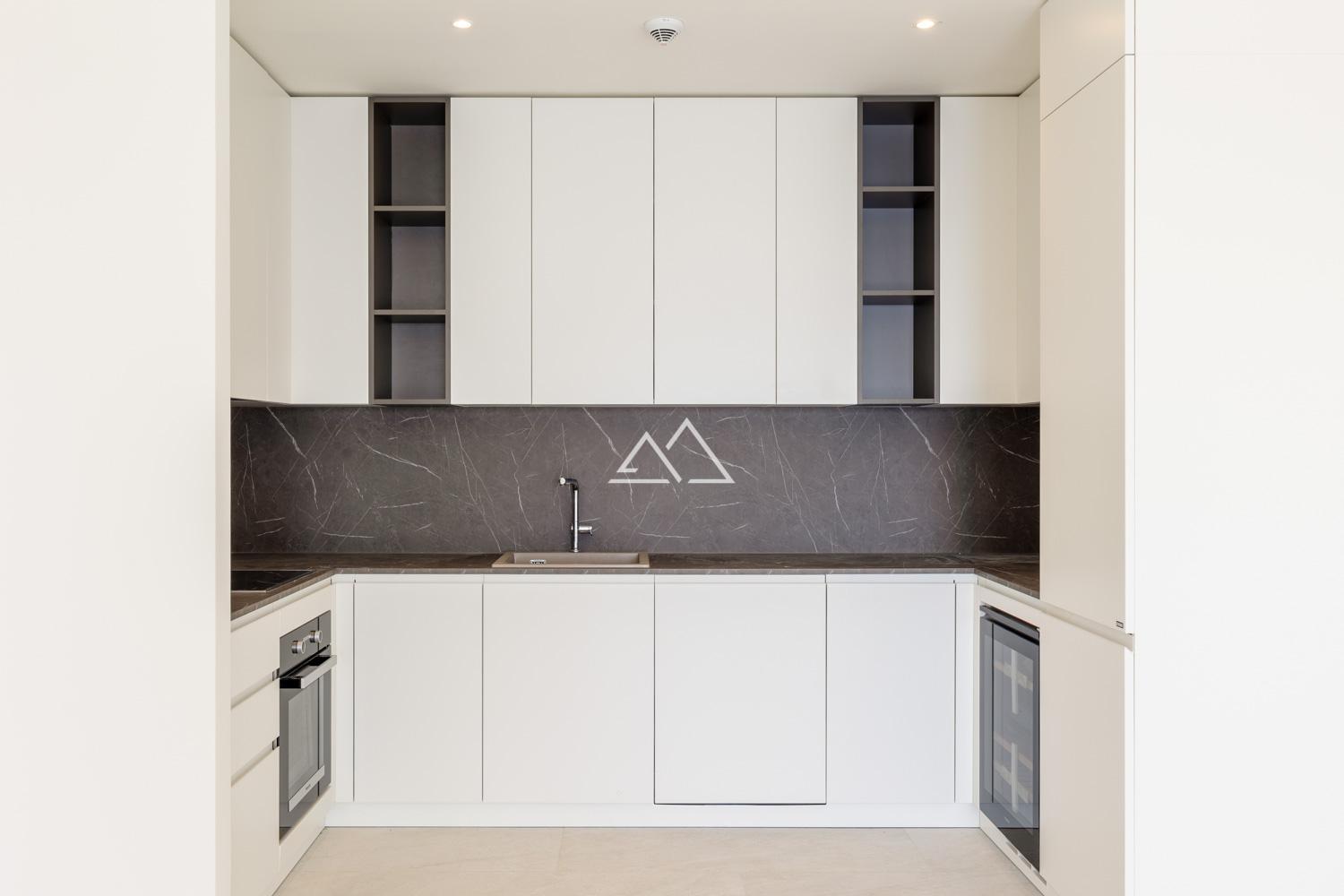 Апартаменты, площадью 94 м2, состоят из просторной гостиной, совмещенной с кухней, с выходом на просторную террасу, спальни с собственной ванной комнатой, коридора, гостевого санузла, бытовой комнаты. Установлена кухня премиум класса с бытовой техникой Miele и встроенные шкафы.