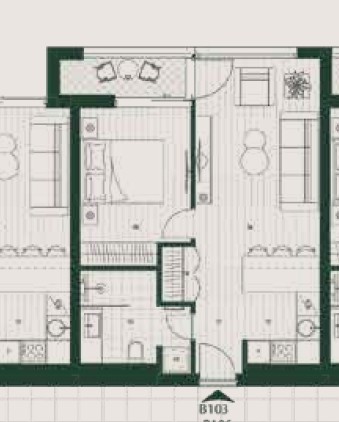 Апартаменты (B-103) площадью 44,97 м2 состоят из гостиной, совмещенной с кухней с выходом на террасу, спальни и ванной комнаты.