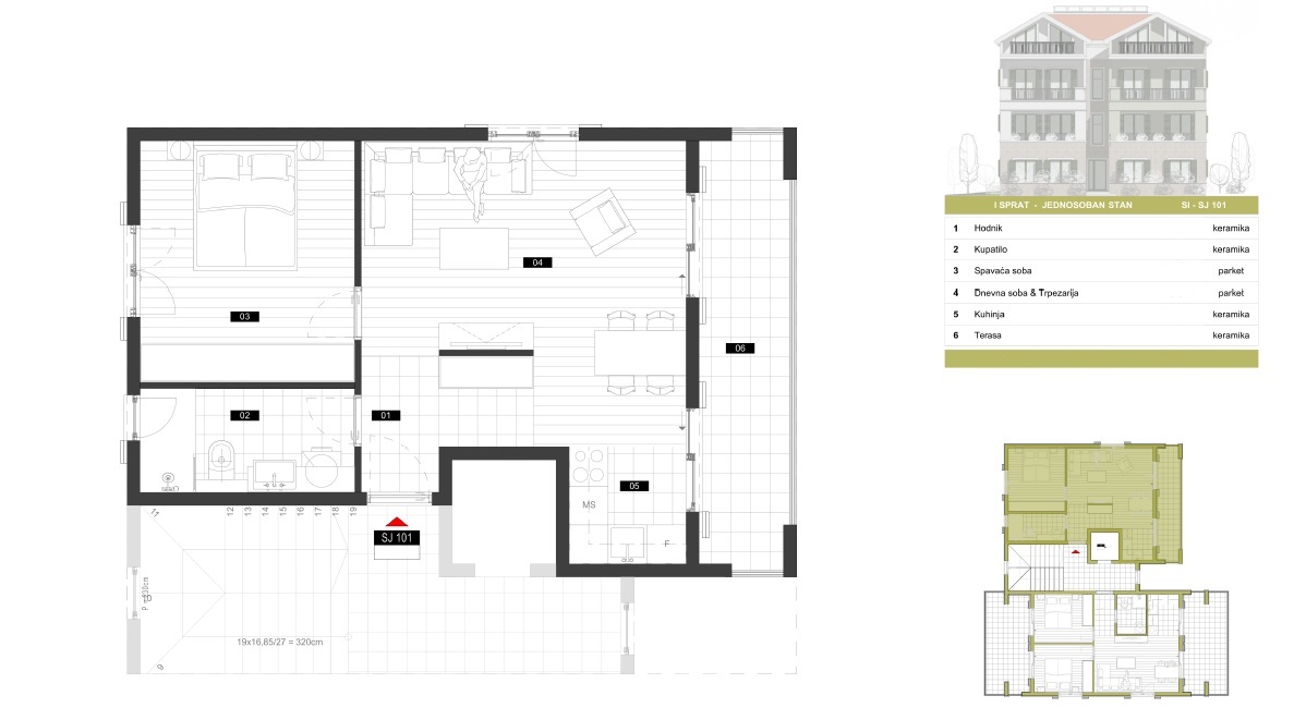 Апартаменты находятся на 2 этаже четырехэтажного здания и включают в себя коридор, ванную комнату, гостиную, совмещенную с кухней и спальню. Из гостиной и зоны кухни есть выход на террасу. Апартаменты продаются в чистовой отделке со встроенной сантехникой.