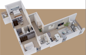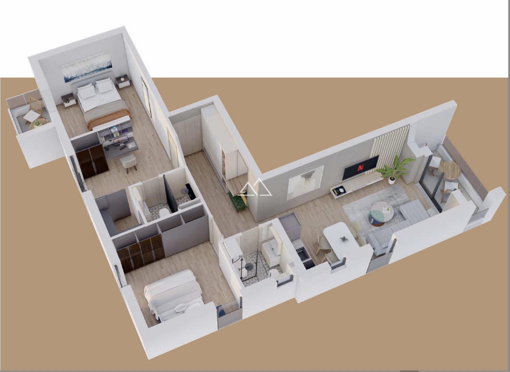 Апартаменты состоят из коридора, гостиной, совмещенной с кухней, двух спален, двух ванных комнат и террасы. Апартаменты продаются в чистовой отделке со встроенной сантехникой.