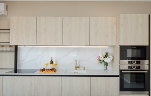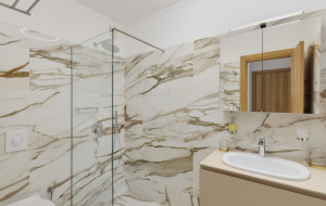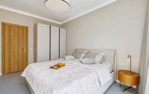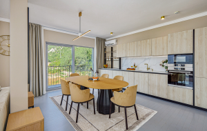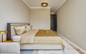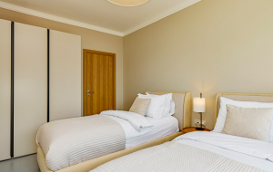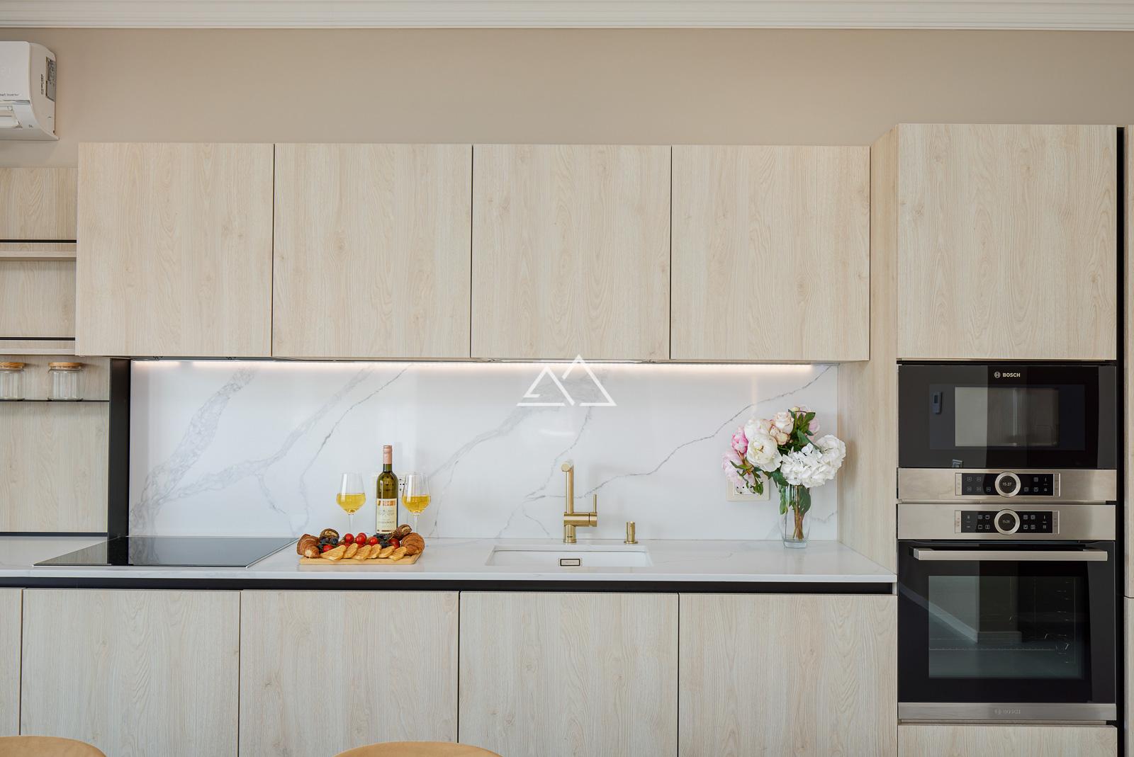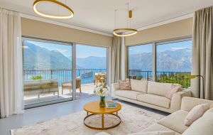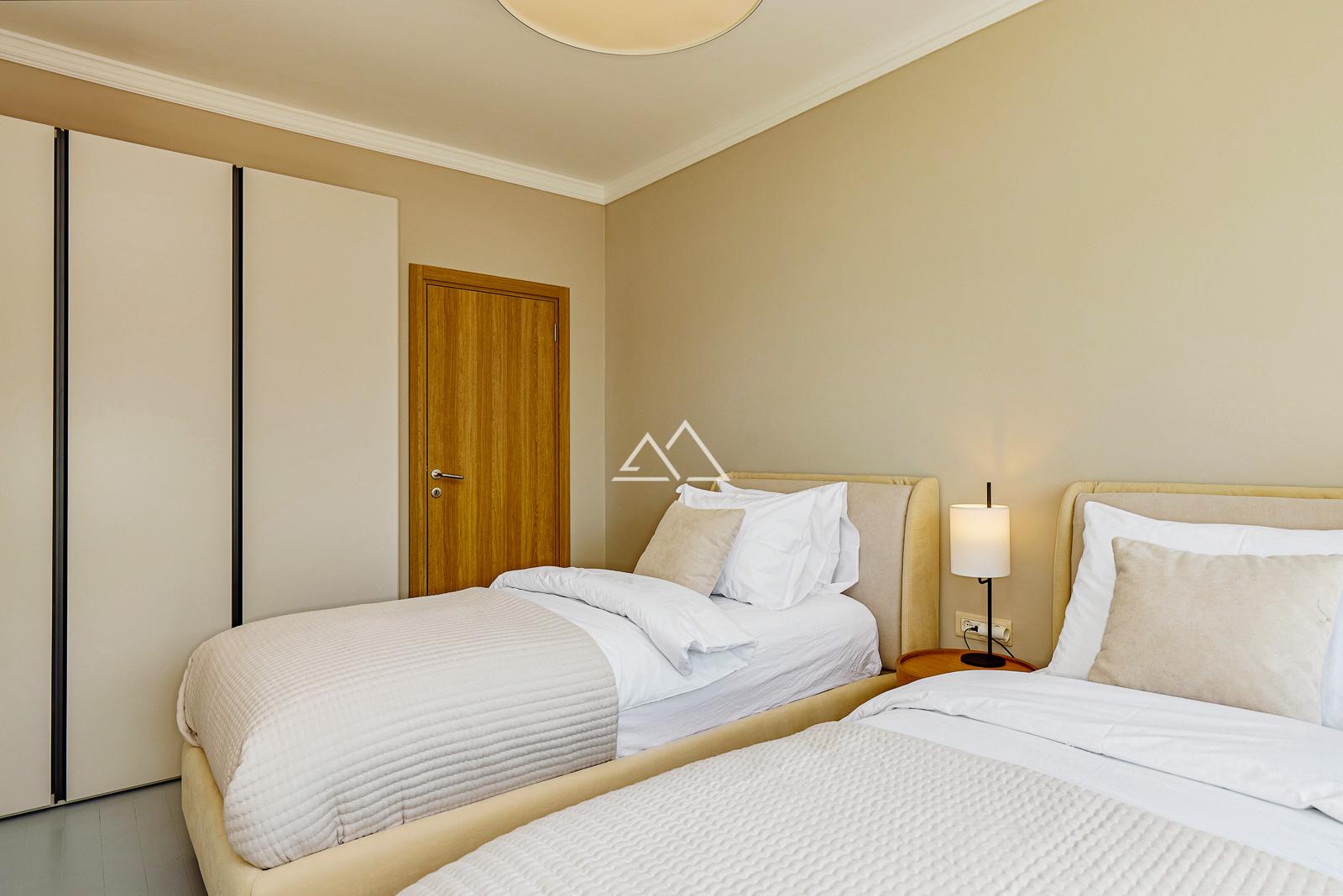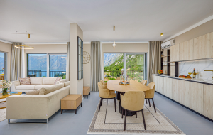 Апартаменты состоят из холла, просторной и очень светлой гостиной, совмещенной с кухней и столовой зоной с выходом на террасу, трех спален, двух ванных комнат и гостевого санузла. Каждая спальня имеет выход на террасу. Из всех комнат имеется потрясающий панорамный вид на море и горы. Апартаменты меблированы новой мебелью итальянских и немецких производителей премиум класса под заказ.