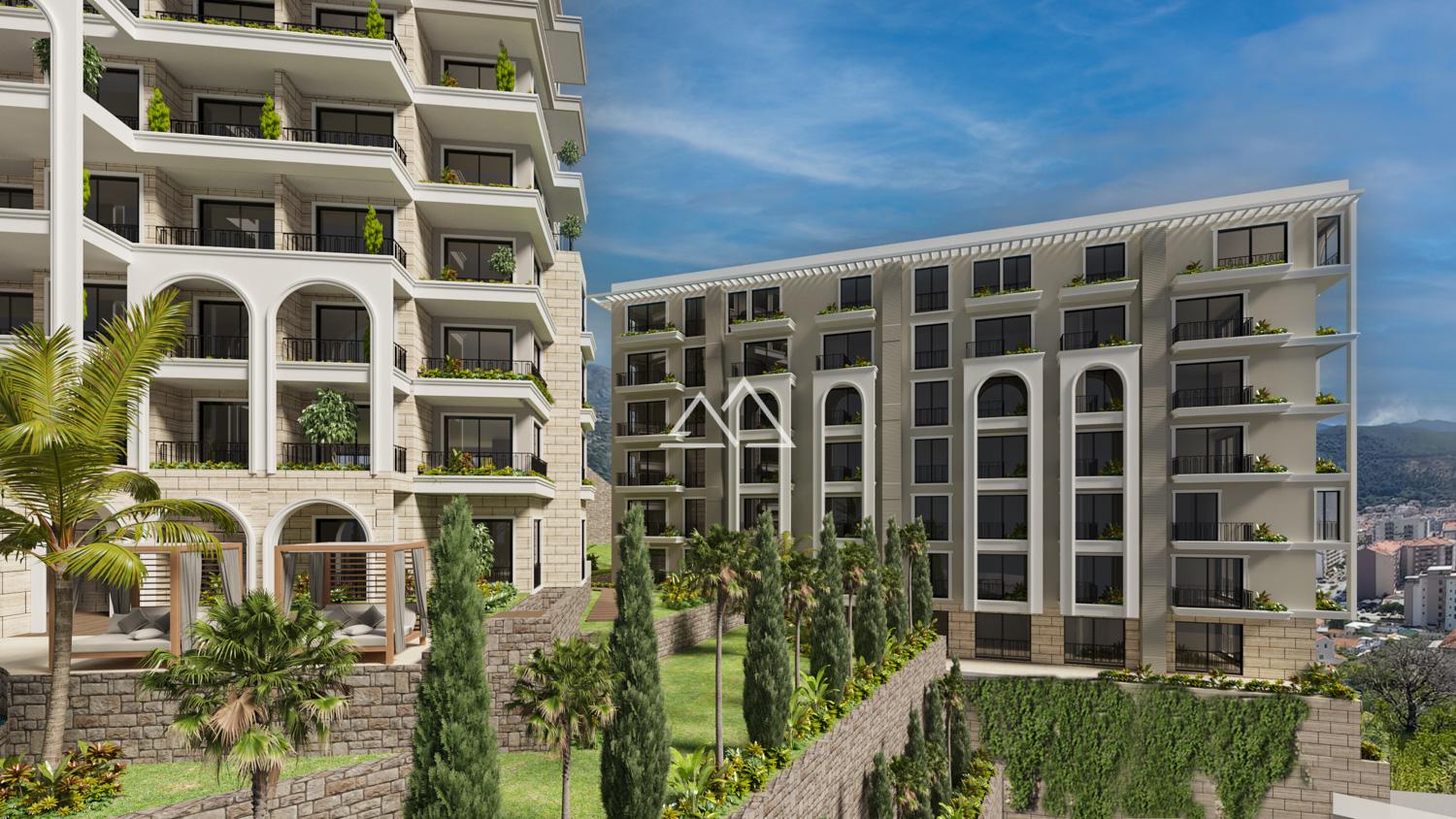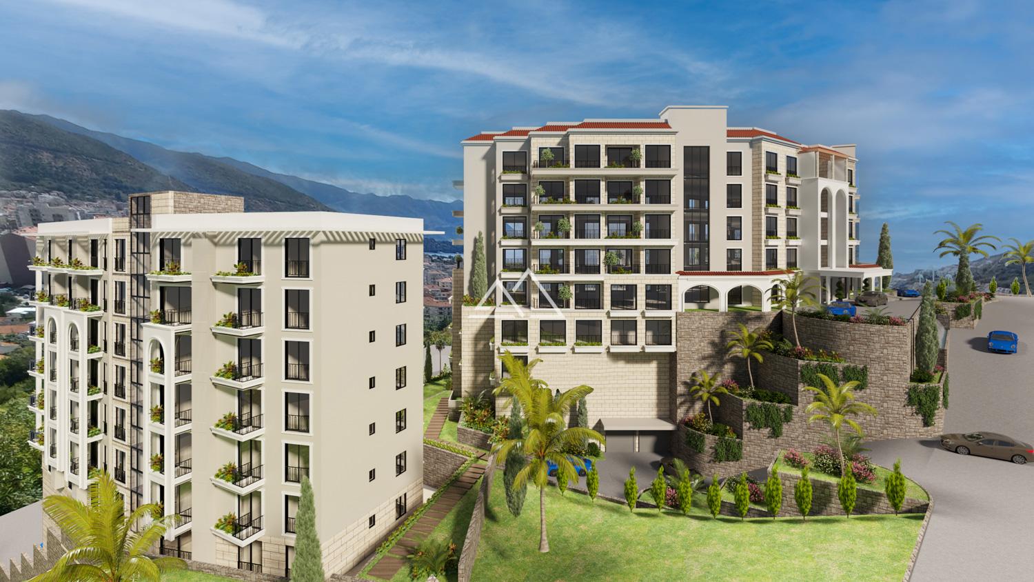 Новый комплекс с собственной инфраструктурой в Будве. Комплекс расположен в черте города на живописном холме. С одной стороны, это позволит жильцам легко и комфортно получить доступ к обширной инфраструктуре Будвы (в радиусе 200 метров расположены магазины, рестораны, кафе, школы, медицинские учреждения), а приятная прогулка до кристально чистых пляжей Будвы займет всего лишь 8-10 минут.