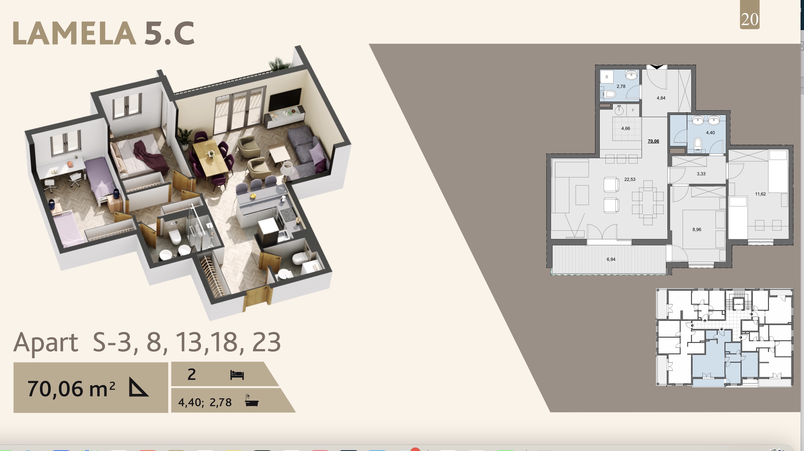 Апартаменты продаются в чистовой отделке со встроенной сантехникой и состоят из обособленного коридора, гостевого санузла, гостиной с выходом на террасу, выделенной зоны кухни, двух спален и ванной комнаты. На стадии строительства владельцы могут реализовать свои дизайнерские идеи и создать комфортное и уютное жилье, отвечающее всем их требованиям и желаниям.