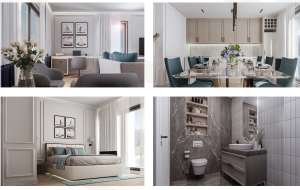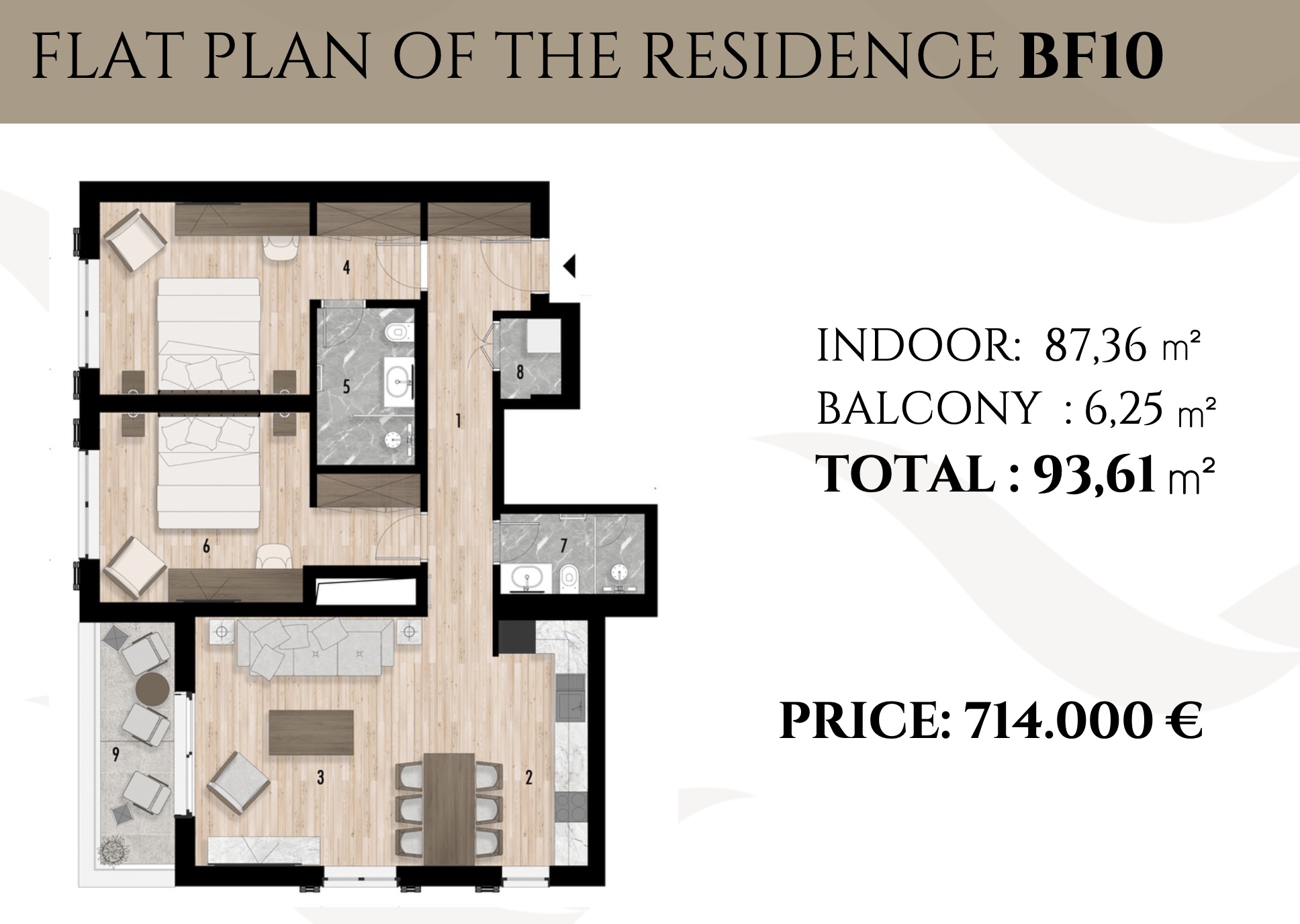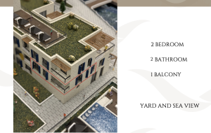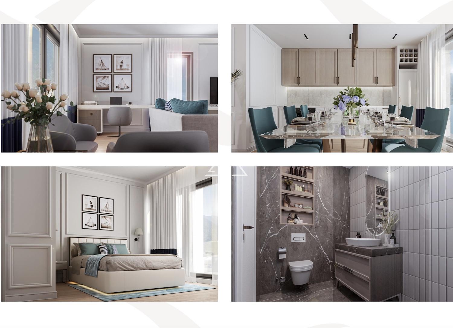Апартаменты находятся на 2 этаже и состоят из коридора, гостиной, совмещенной с кухней и столовой зоной с выходом на террасу, 2 спален и 2 ванных комнат. Апартаменты продаются с отделкой и мебелью премиум класса.