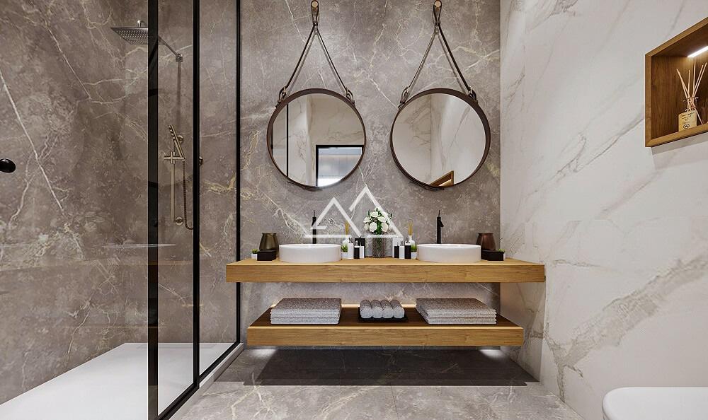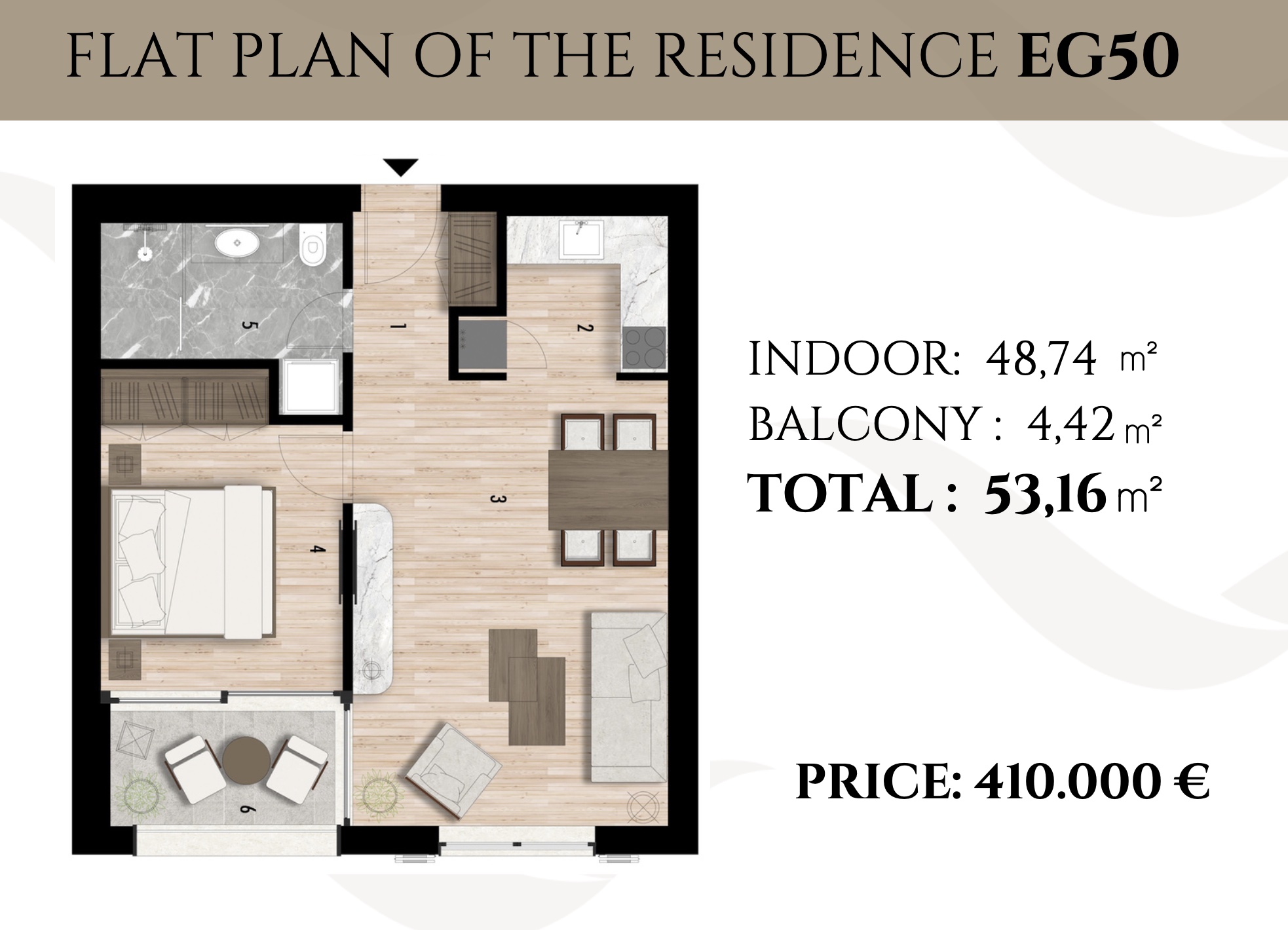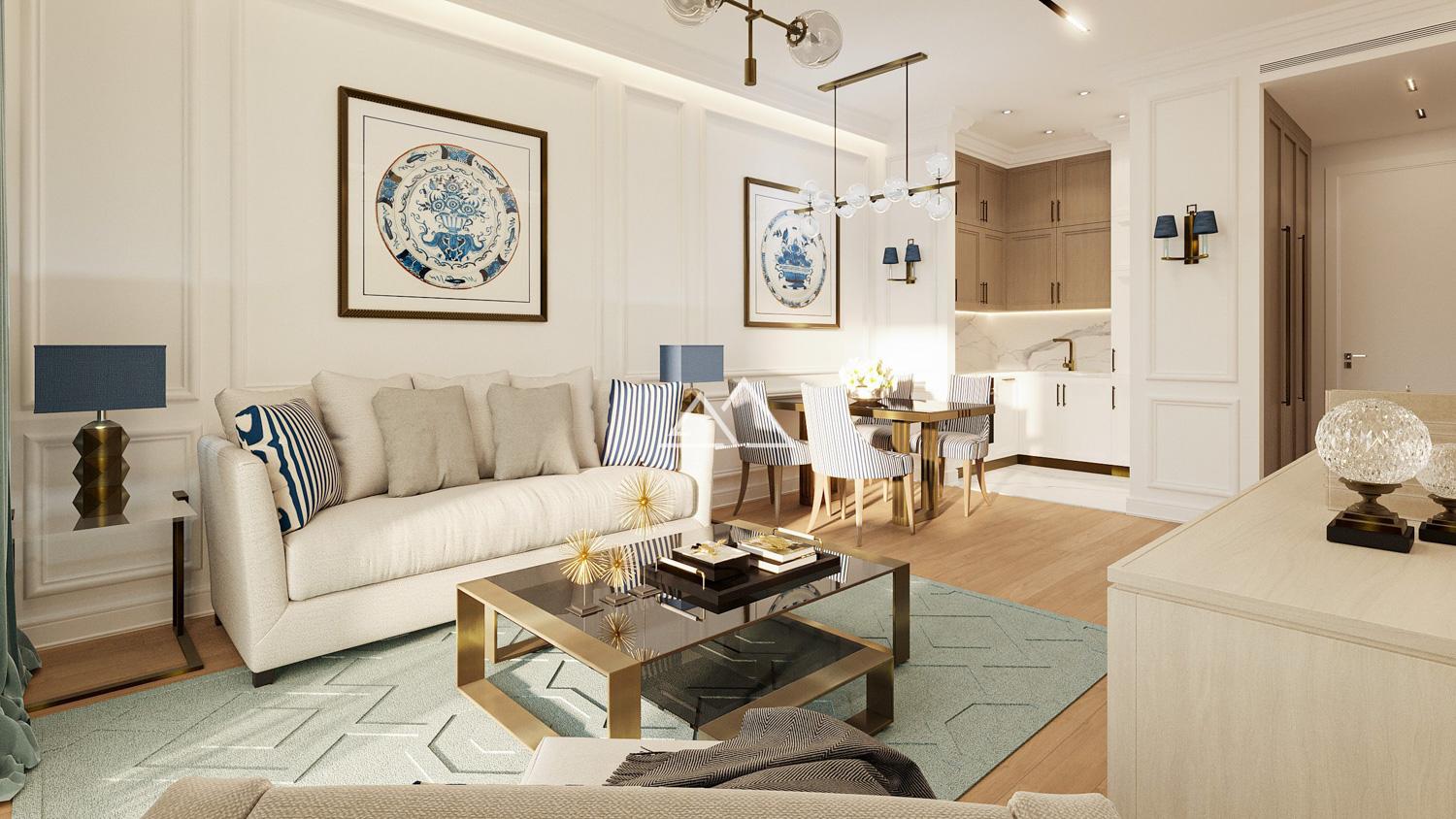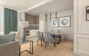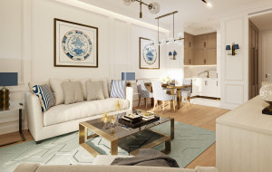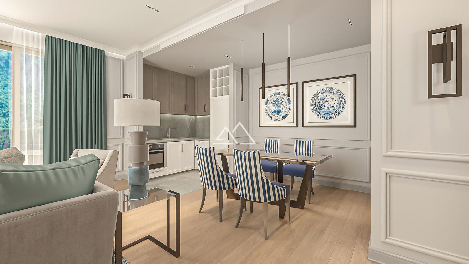 Апартаменты состоят из коридора, гостиной, совмещенной с кухней с выходом на террасу, спальни и ванной комнаты. Апартаменты продаются с отделкой и мебелью премиум класса.