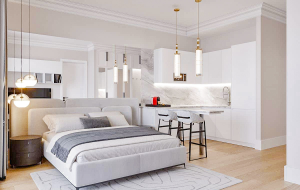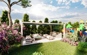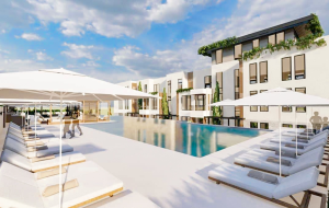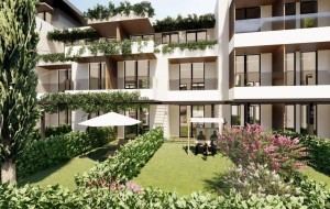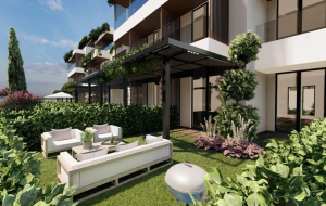 Апартаменты (76 м2) расположена на 1 этаже и состоят из гостиной, совмещенной с кухней, 2 спален, 2 ванных комнат и террасы с собственным двориком (59 м2).