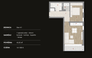 Квартира состоит из коридора, ванной комнаты, бытовой комнаты, гостиной, совмещенной с кухней с выходом на террасу и спальни. Квартира продается в чистовой отделке со встроенной сантехникой.