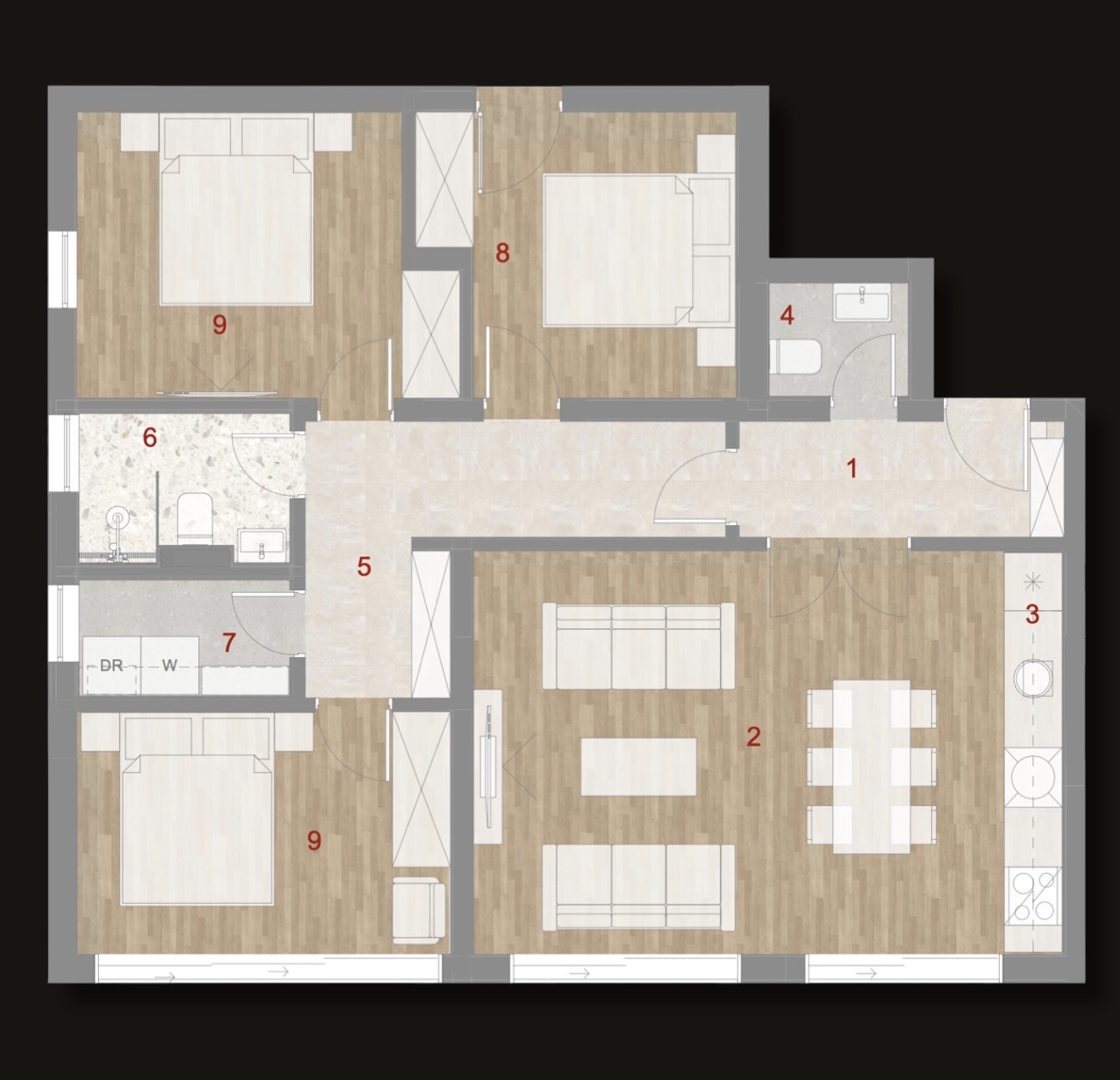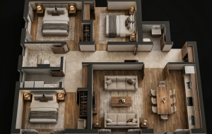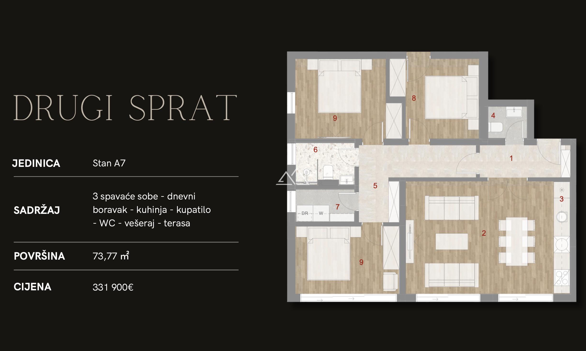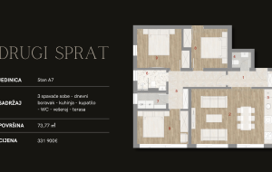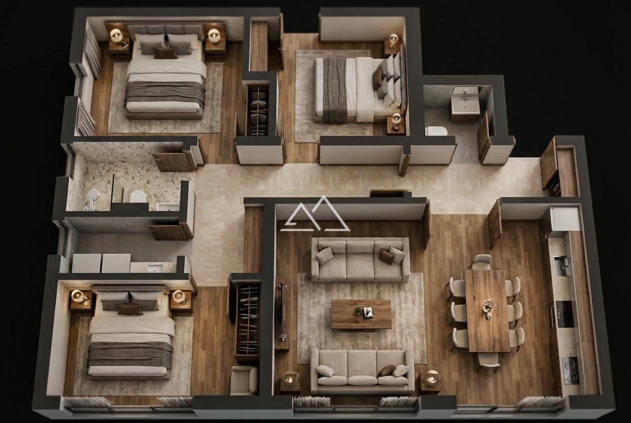Квартира находится на 3 этаже и состоит из коридора, гостевого санузла, бытовой комнаты, гостиной, совмещенной с кухней, трех спален и ванной комнаты. Из окон открывается панорамный вид на море и старый город Котор.