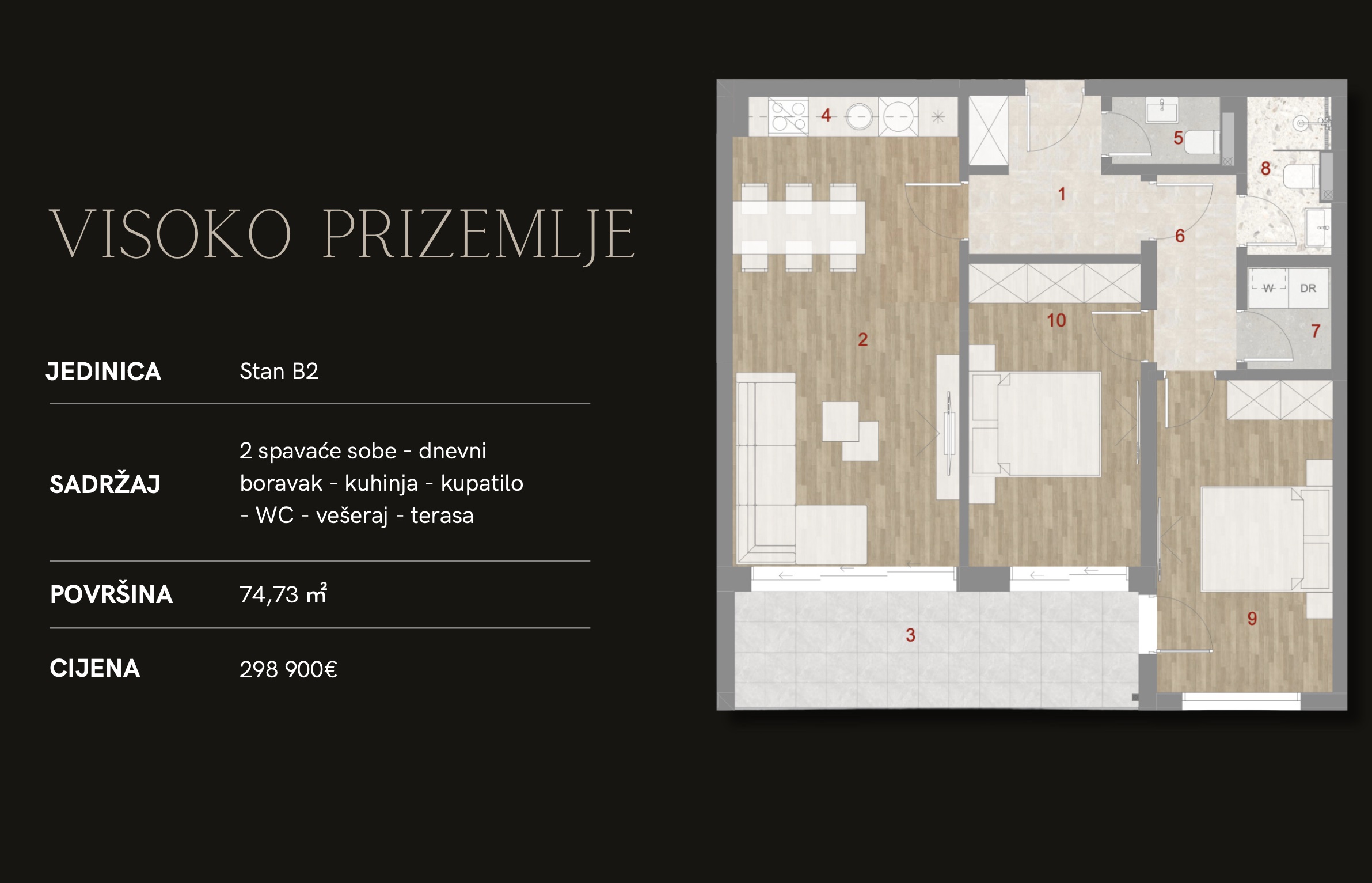 Квартира состоит из коридора, гостевого санузла, бытовой комнаты, гостиной, совмещенной с кухней, двух спален и ванной комнаты. Каждая комната имеет выход на террасу.