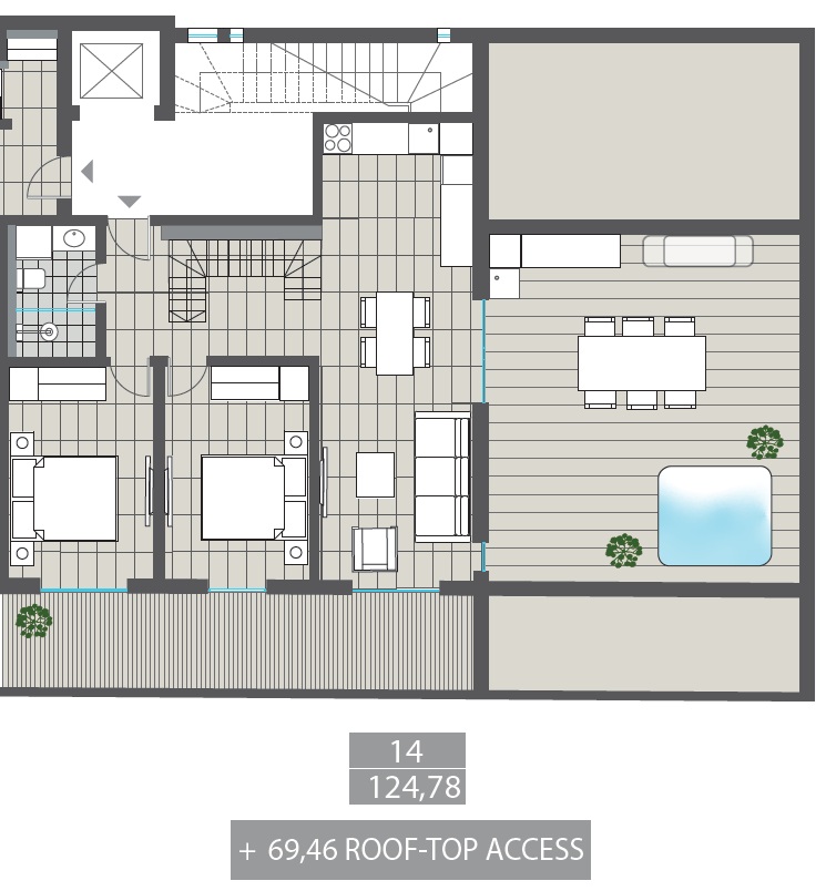 • Доступ к эксклюзивному участку крыши площадью 69,46 м²