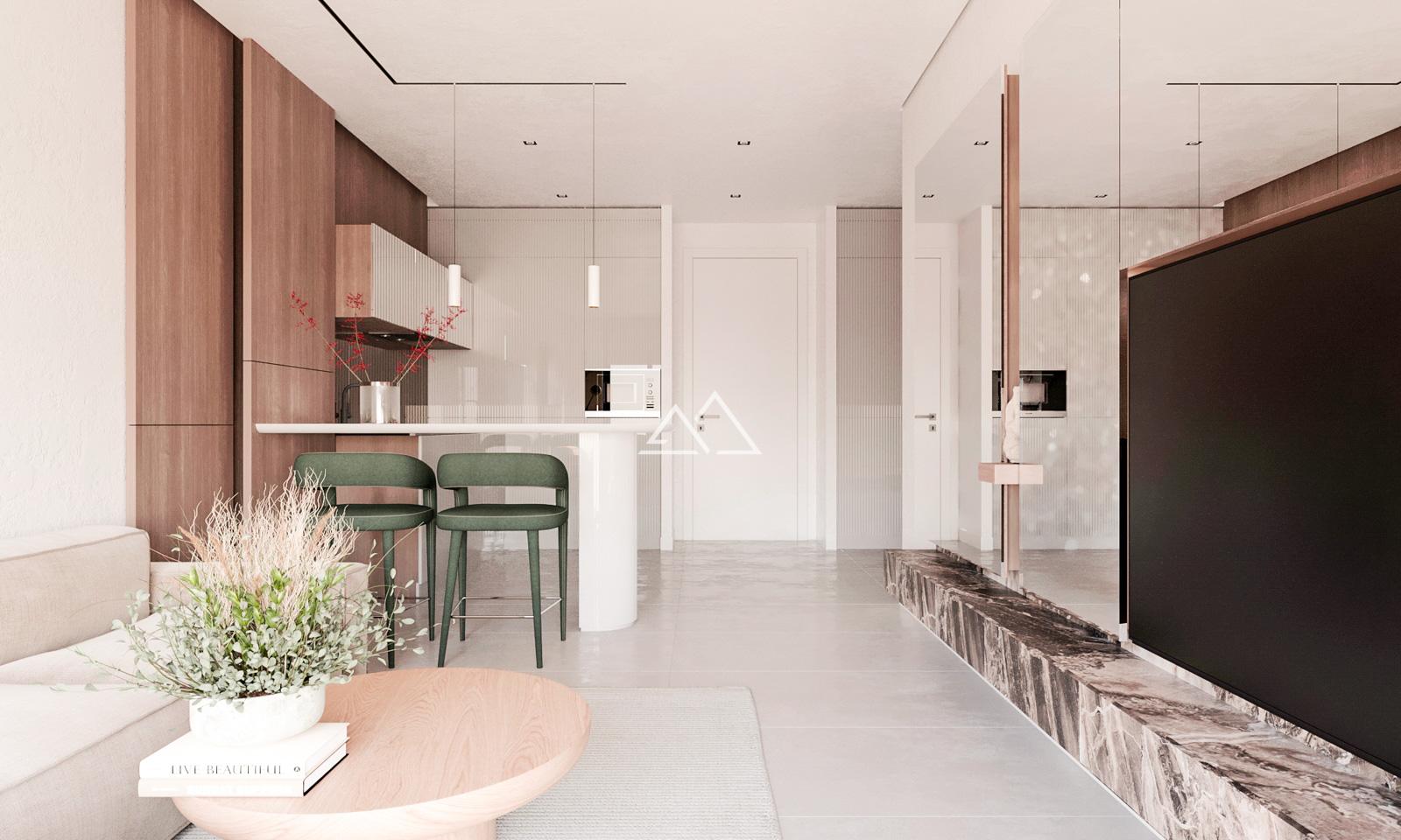 • Планировка: коридор, гостиная, объединённая с кухней, 2 спальни, ванная комната, терраса и зеленая терраса