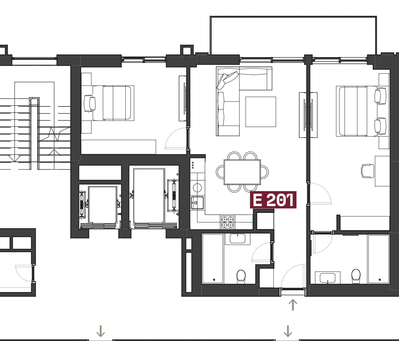 Апартаменты продаются в чистовой отделке со встроенной сантехникой и состоят из просторной гостиной, совмещенной с кухней с выходом на террасу, 2 спален и двух ванных комнат.