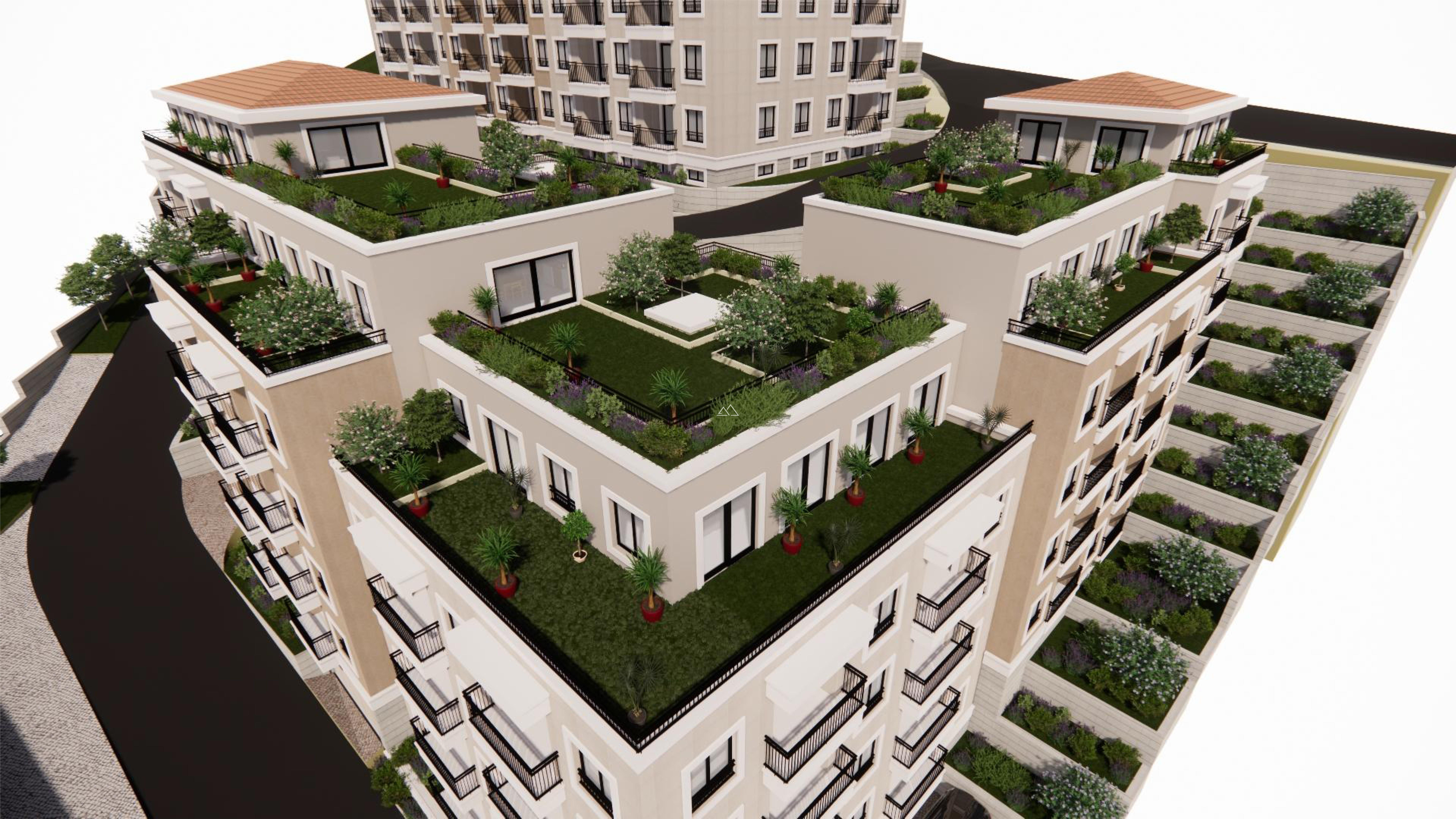 Уникальное террасное расположение комплекса на склоне обеспечивает панорамные виды даже с нижних этажей, а из окон и террасы пентхауса открываются особенно впечатляющие панорамы.