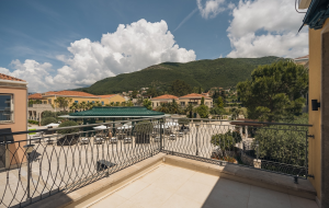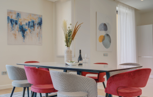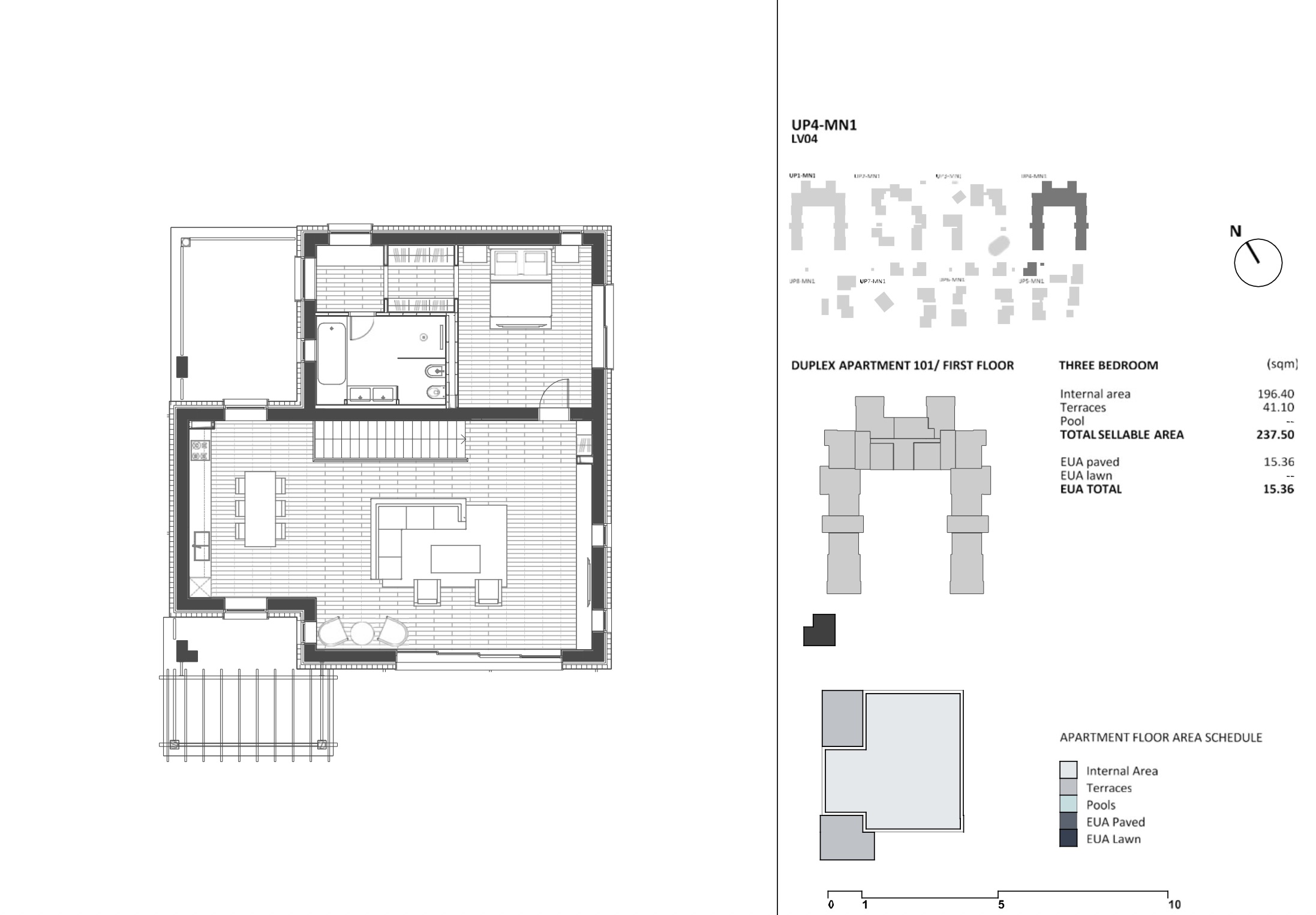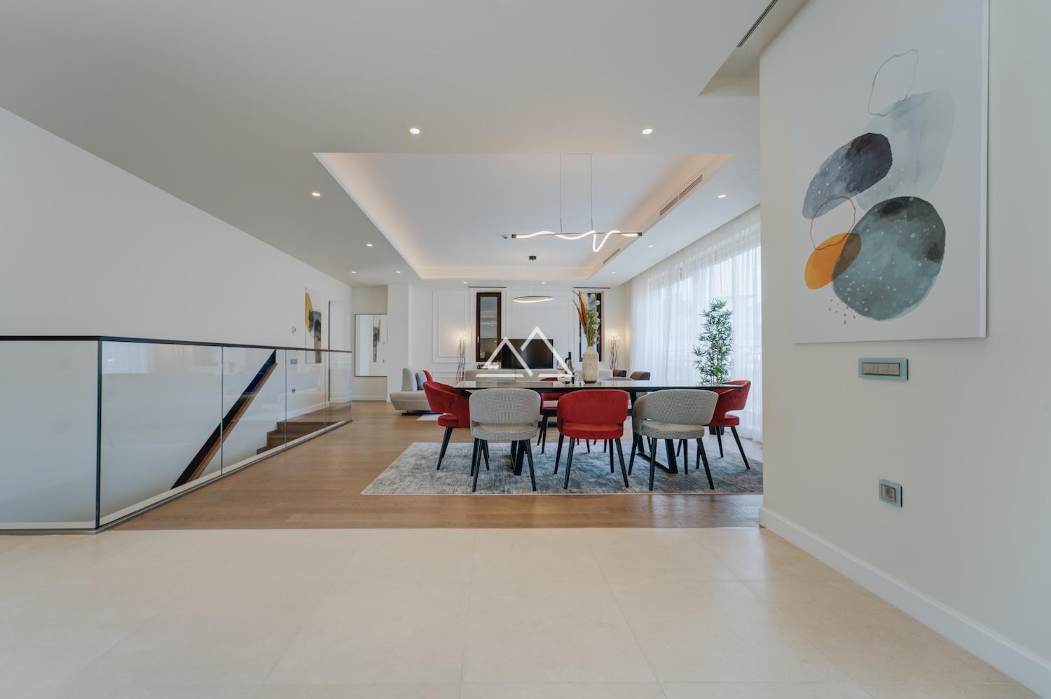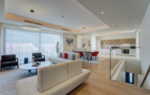 Общая площадь апартаментов — 237 м². Апартаменты занимают 1-й и 2-й этаж эксклюзивного малоэтажного дома на центральной площади курорта. Планировка включает просторную гостиную с кухней и столовой зоной, 3 спальни, большую крытую террасу площадью 41 м², 3 ванные комнаты и гостевой санузел. В стоимость входит высококачественная мебель и бытовая техника, а также право пользования частным парковочным местом в подземном гараже.