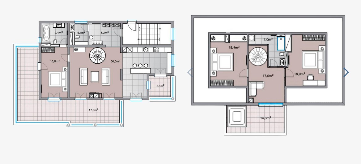 2 уровень: кованая винтовая лестница ведёт на второй этаж пентхауса, где расположены две спальни и большой холл с выходом на террасу с джакузи. По периметру второго этажа предусмотрены дополнительные места для хранения. Из всех окон пентхауса открываются потрясающие виды на Бока-Которский залив