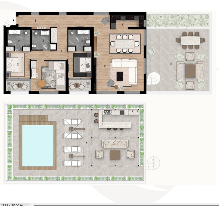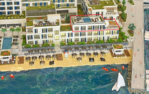 Пентхаус занимает общую площадь 384,39 м². Он состоит из просторной гостиной, совмещённой с кухней и обеденной зоной, трёх спален, трех ванных комнат. В распоряжении владельцев два балкона, а также две частные террасы площадью 61,63 м² и 138,30 м² с зелёной зоной (27,77 м²) и собственным бассейном (20,66 м²), откуда открываются захватывающие виды на море и побережье.