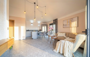 — светлая гостиная с интегрированной кухней и обеденной зоной