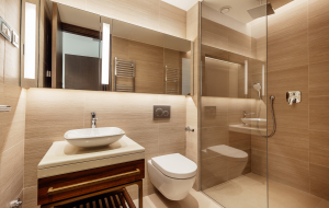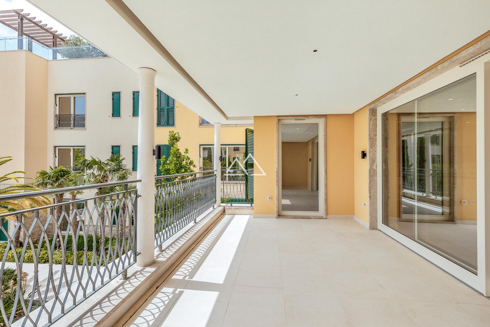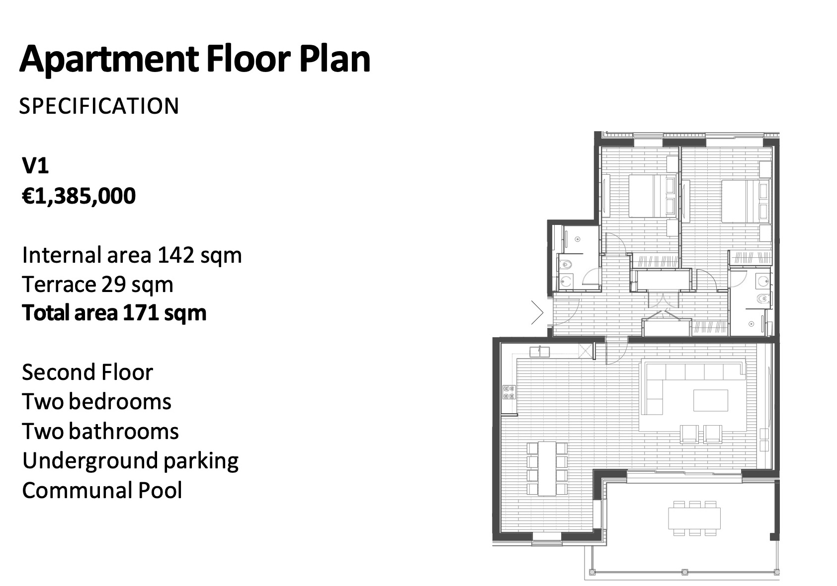 - функциональная и продуманная планировка: с одной стороны — просторная, наполненная светом гостиная с выходом на террасу и зона кухни, с другой — две изолированные спальни, каждая с собственной ванной комнатой;